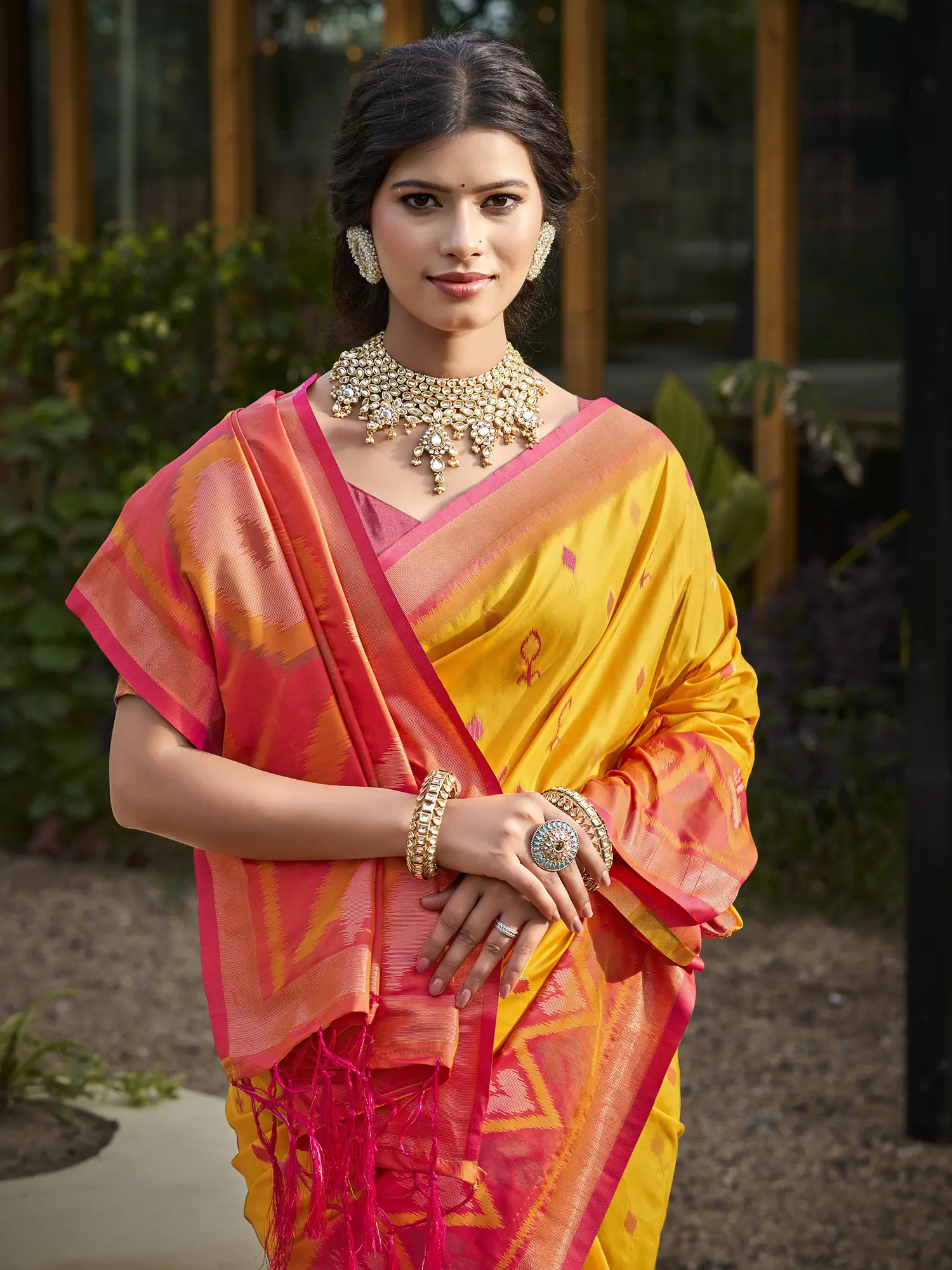 Festive Silk Saree With Bold Ikat Inspired Border Ideal For Wedding Functions Parties And Traditional Occasions
