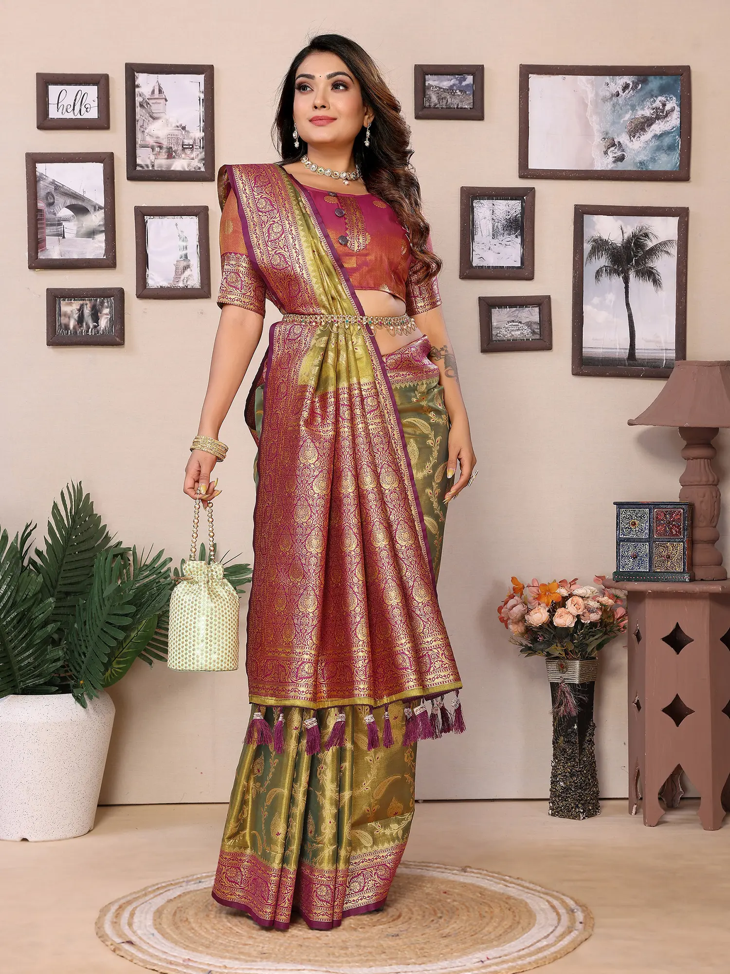 This saree is more than just a garment; it's an experience. It's designed to make you feel radiant and confident at any festive gathering, wedding, or special event. Its inherent elegance allows it to be styled in various ways, from a classic drape to more contemporary interpretations. The lightweight nature of tissue silk ensures comfort without compromising on grandeur, making it an ideal choice for extended celebrations. Embrace the artistry and heritage embodied in this stunning creation and let it be the highlight of your festive attire.