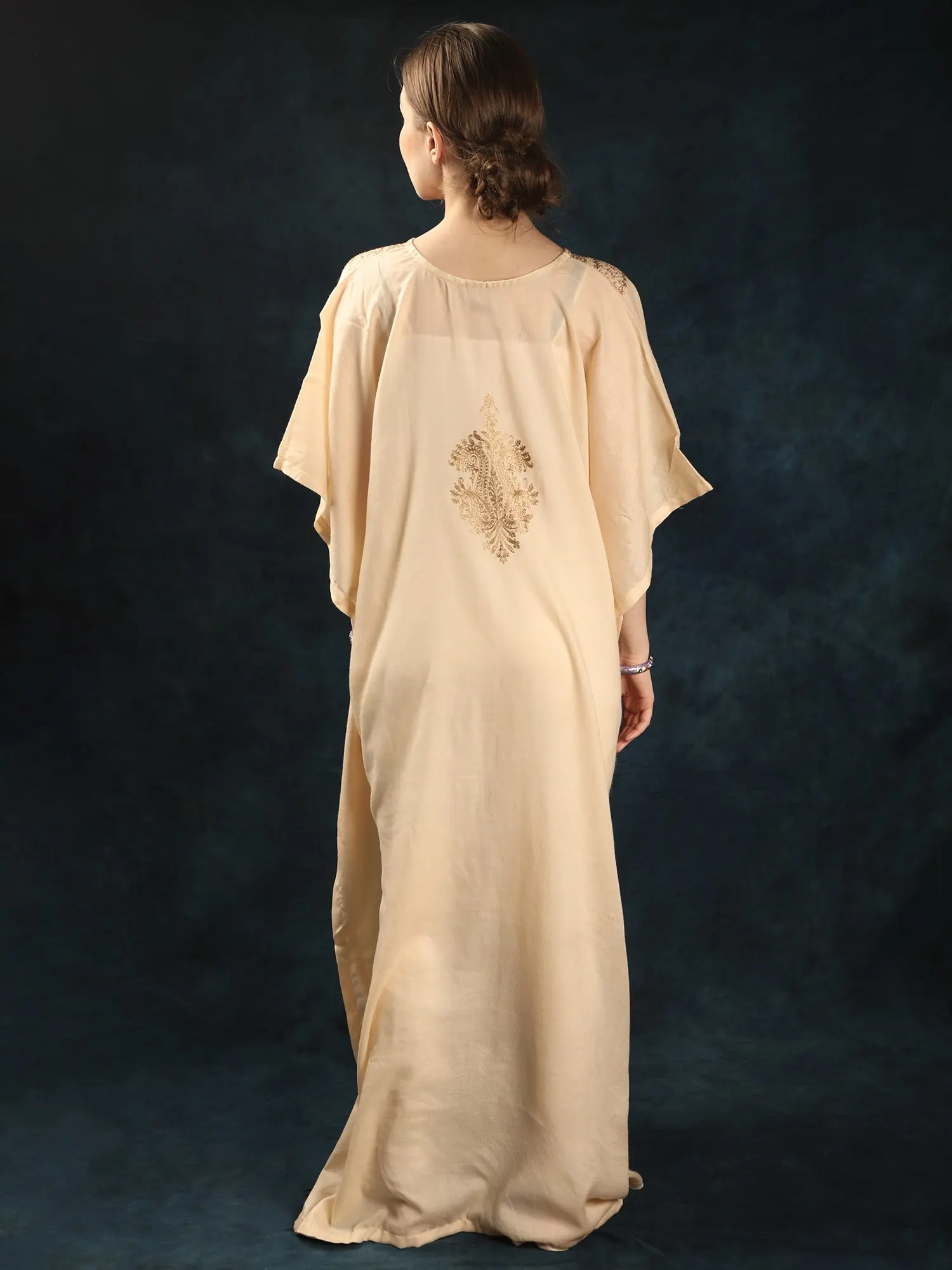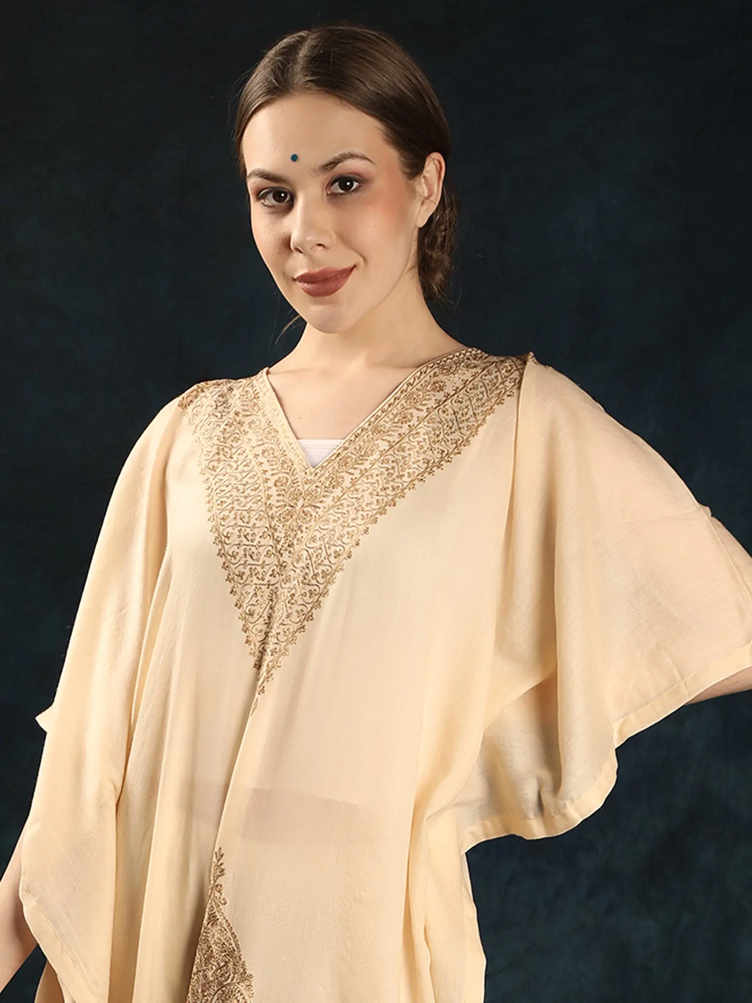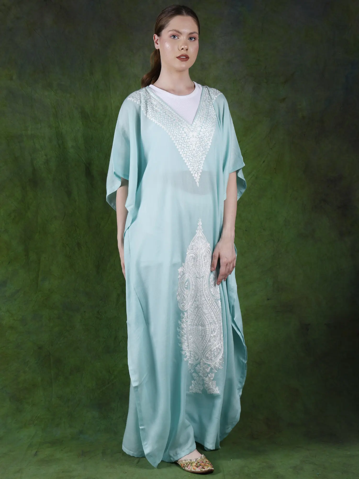 This Srinagar kaftan transcends fleeting trends, offering a timeless appeal that can be styled in numerous ways. For an evening of elegance, pair it with statement jewelry and delicate heels. For a more relaxed yet chic look, complement it with sandals and minimalist accessories. It’s also an ideal choice for special gatherings, cultural events, or simply when you wish to envelop yourself in an aura of sophisticated grace. This kaftan is not merely an outfit; it's an experience of comfort, art, and tradition, designed to make you feel as magnificent as you look.