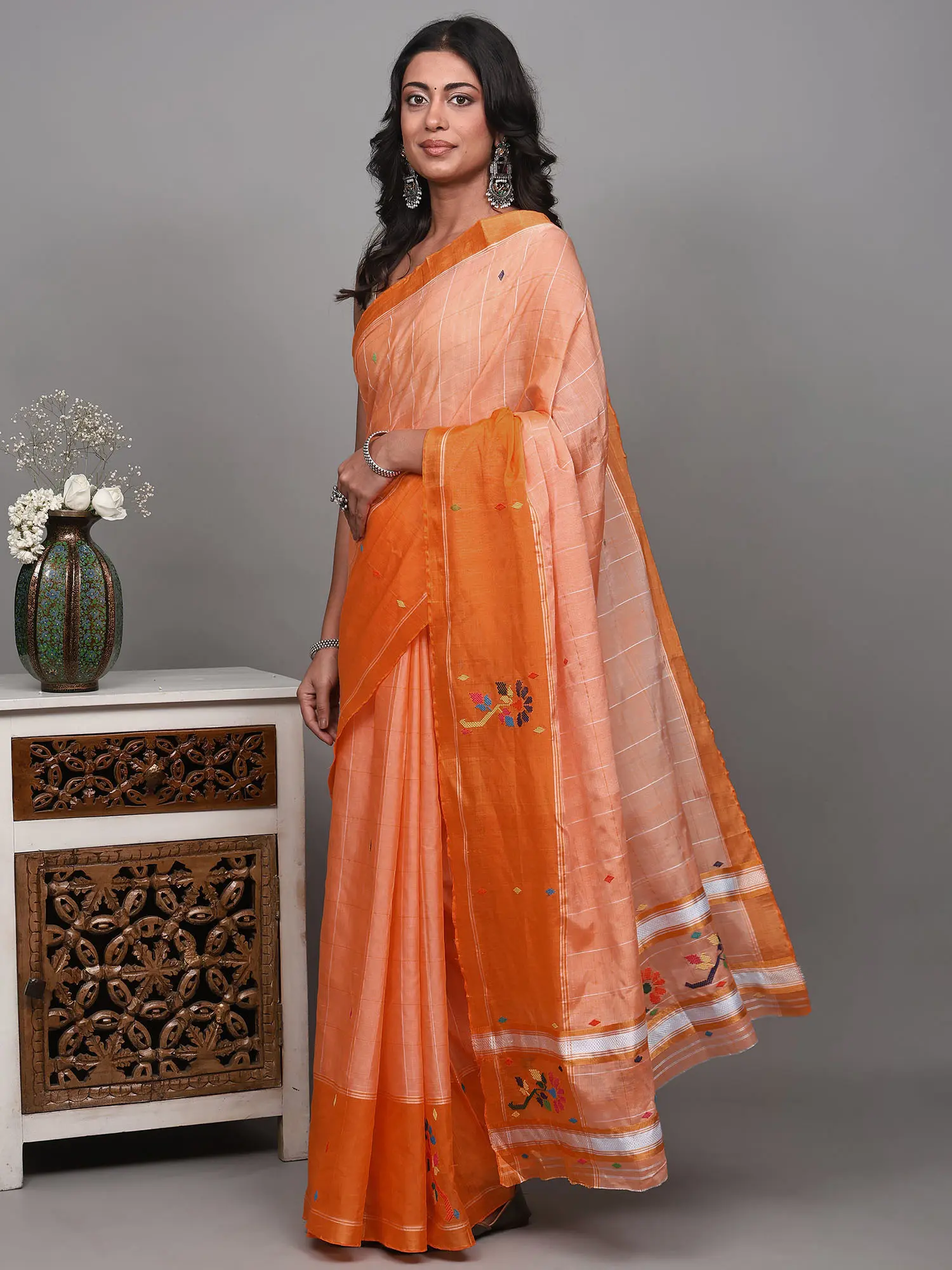 Drape yourself in the vibrant elegance of this exquisite saree, a testament to the rich weaving traditions of Tamil Nadu. The captivating coral orange hue evokes the warmth of sunshine and the joy of festivity, making it a perfect choice for special occasions or when you simply want to radiate confidence and charm.