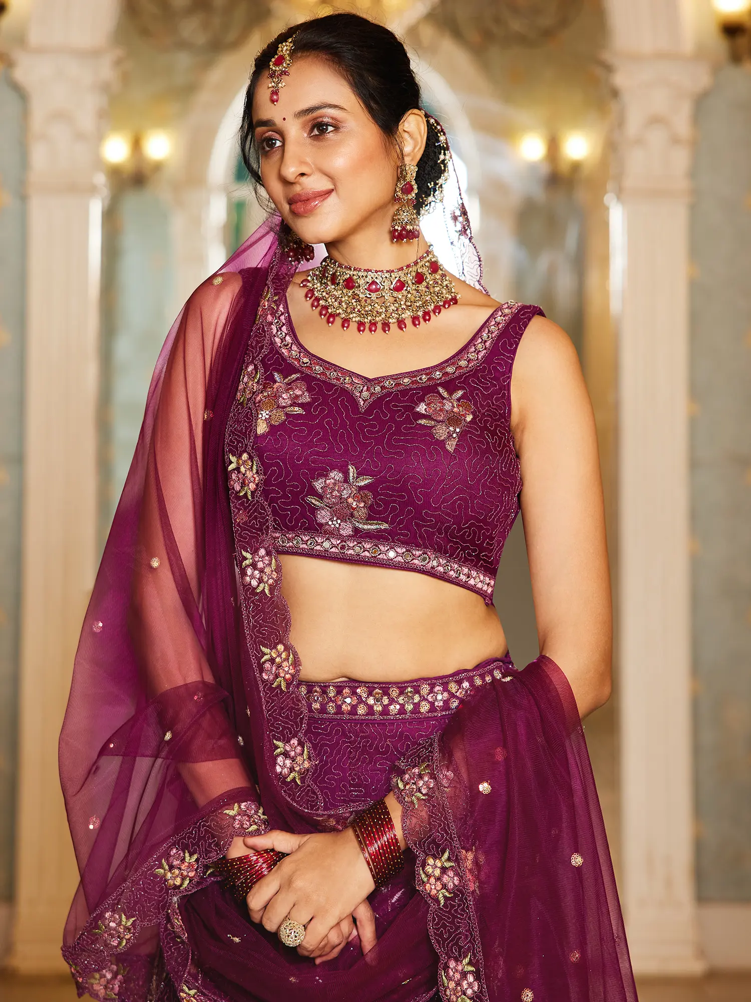 Red Soft Net Embroidered Lehenga Choli with Scalloped Dupatta