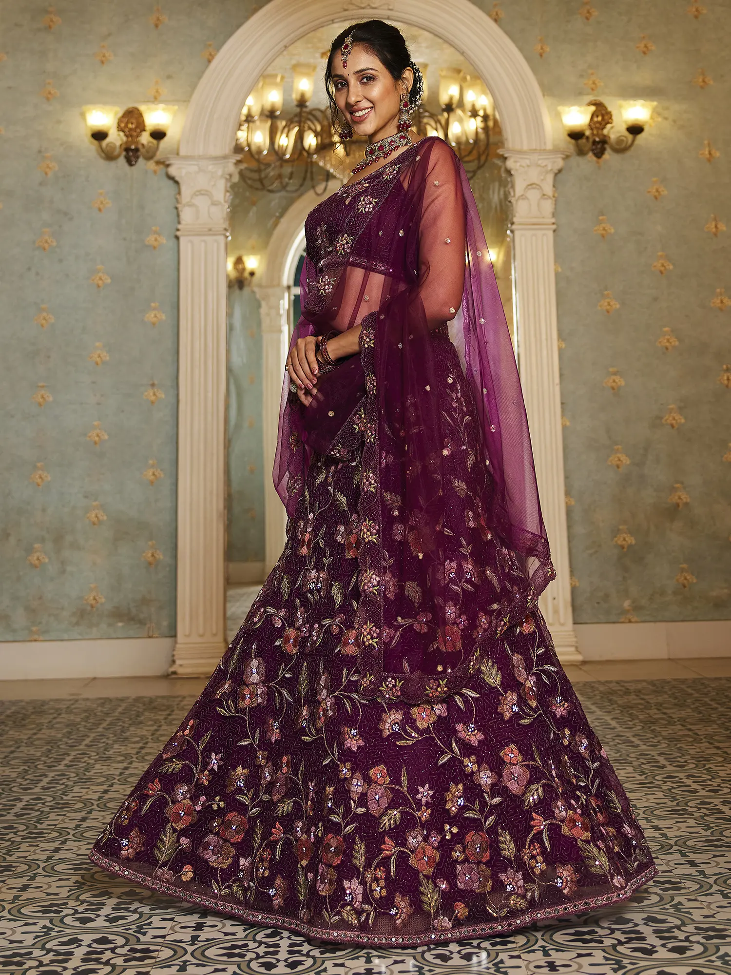 Adorned with a vibrant symphony of floral patterns, this creation showcases a rich palette of colors and textures. The cording embroidery adds dimension and depth, catching the light with subtle sparkle. The accompanying dupatta, a whisper-light net, echoes the exquisite embellishments of the lehenga and choli, completing the harmonious design. Crafted to fit size 36, you'll find its proportions to be elegantly balanced.