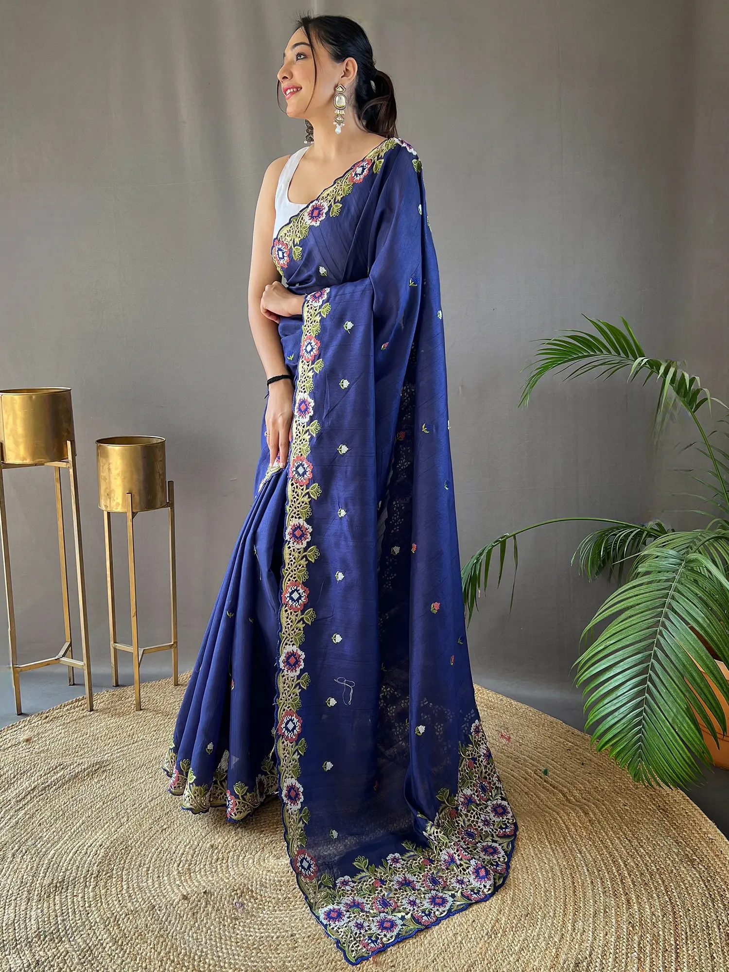 Meadow-Mist Designer Saree with Floral Embroidery in Tonal Thread and Beads
