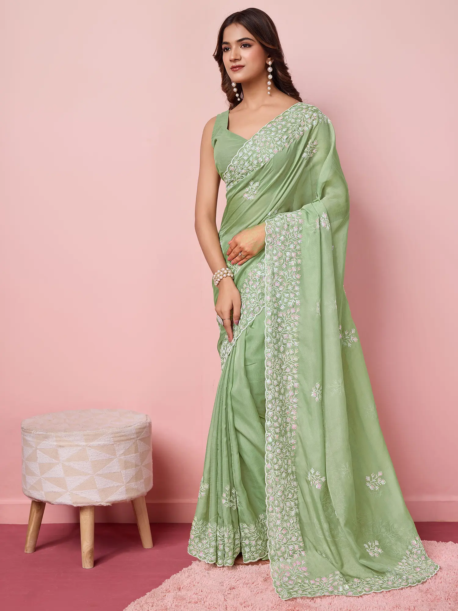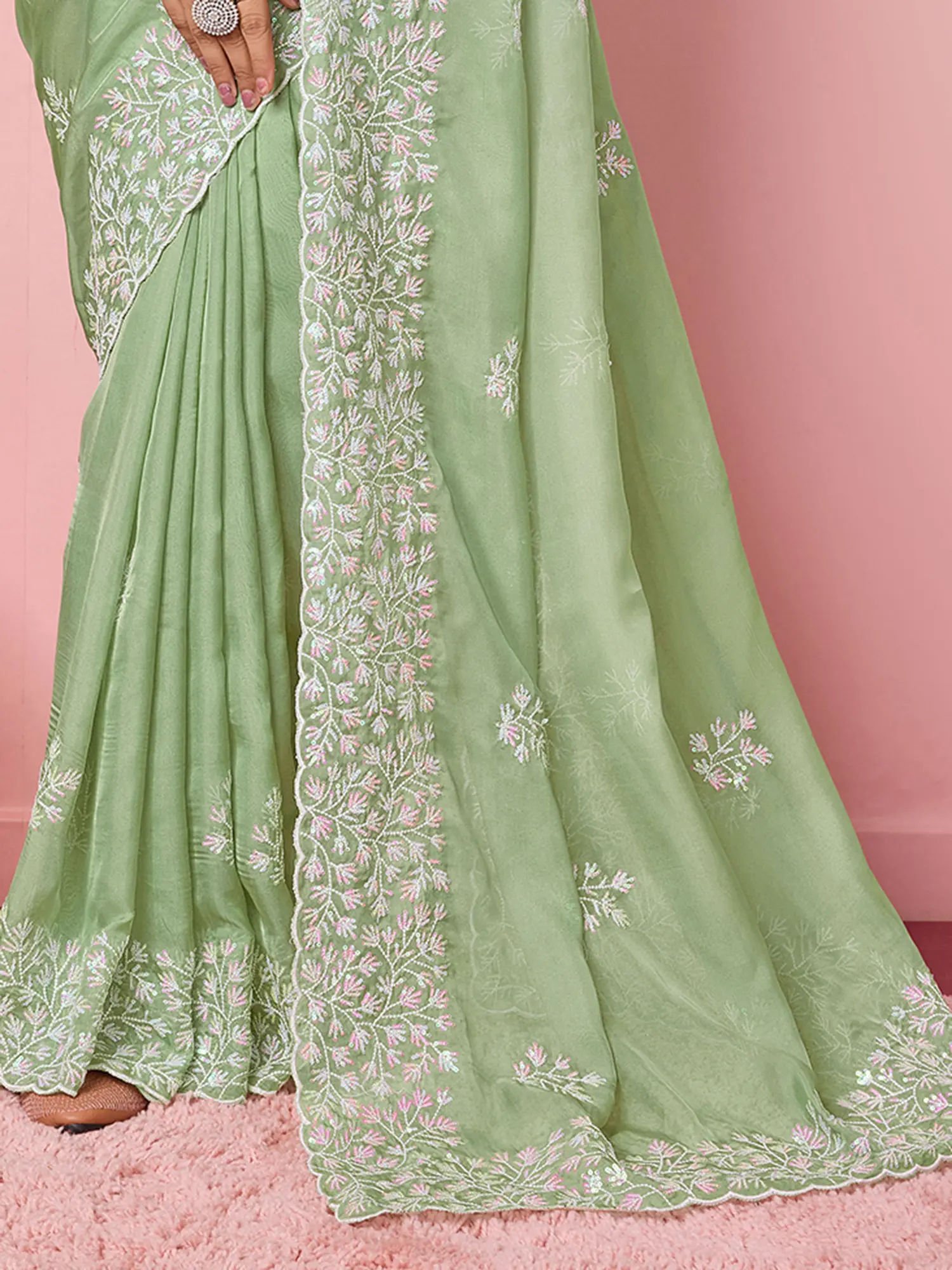 Pistachio-Green Crepe Saree from Kashmir with Aari Embroidered Bootis and Floral Vines Border-Pallu