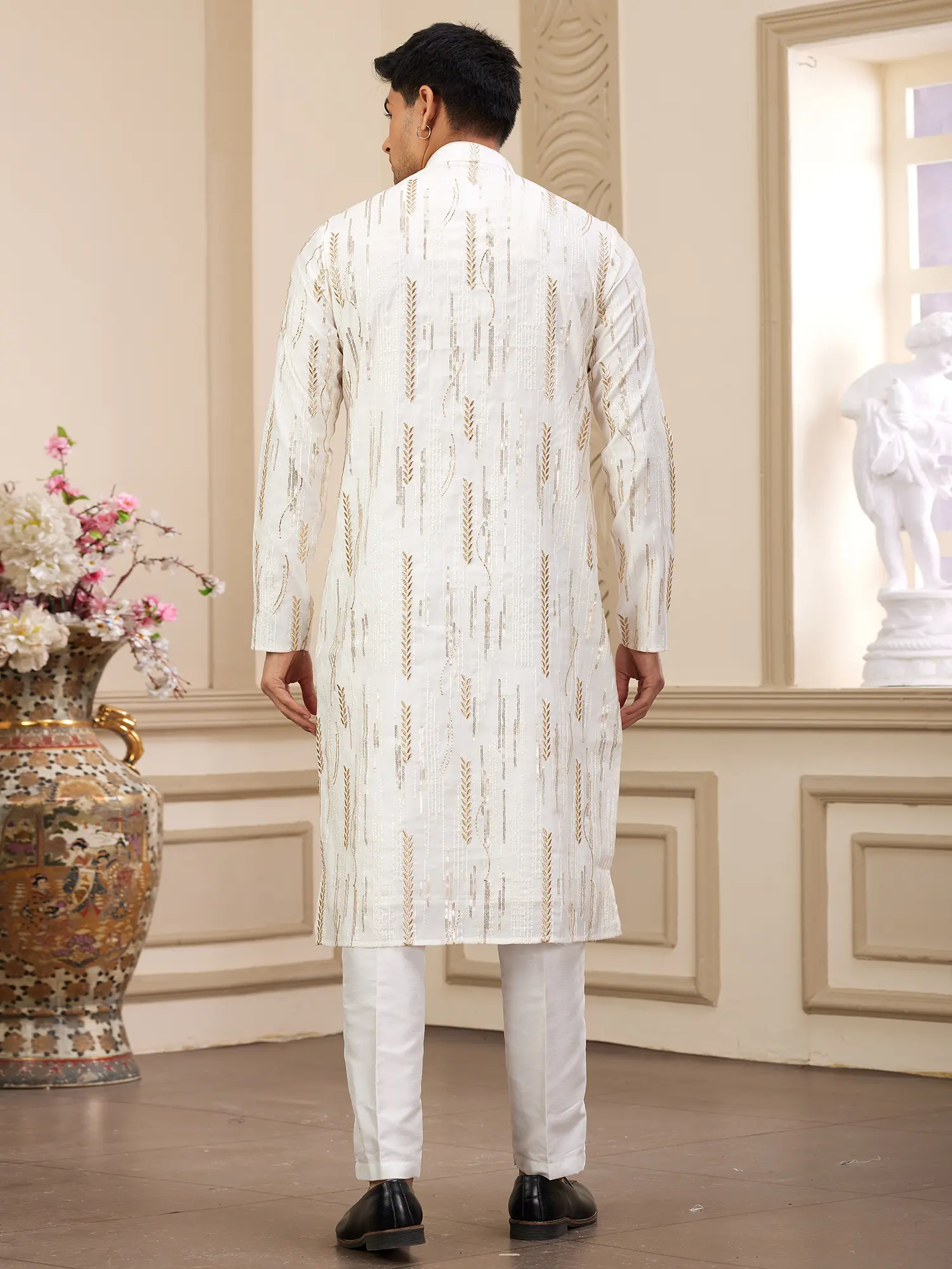Metallic-Thread Embroidered Kurta Pajama with Floral Fauna Motifs and Sequins work