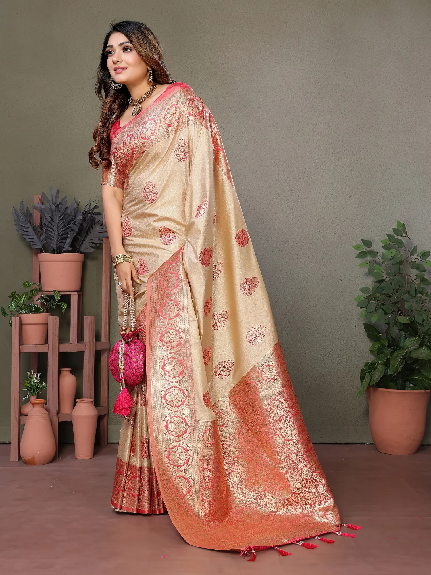 Discover a masterpiece of traditional Indian craftsmanship with this exquisite Viscose Silk saree. Designed for the discerning individual who appreciates the finer things in life, this saree is a celebration of intricate artistry and luxurious fabric. The rich, creamy beige hue of the Viscose Silk provides a sophisticated canvas for the opulent woven motifs, creating a visual symphony that is both captivating and refined. This is more than just a garment; it's an heirloom piece, perfect for marking life's most cherished moments.