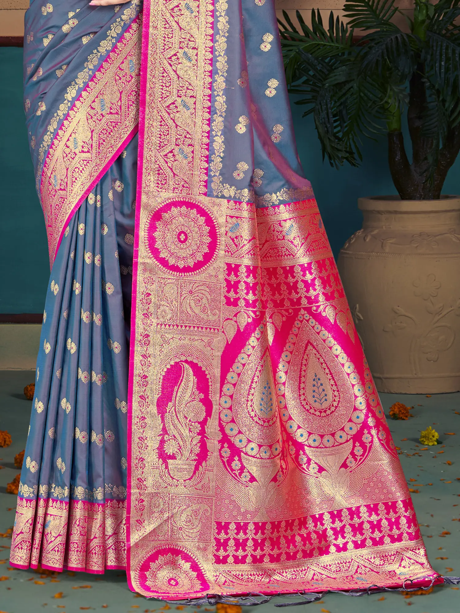 Step into a world of refined beauty and exquisite craftsmanship with this stunning designer silk saree. Crafted from luxurious silk, this saree drapes beautifully, exuding an aura of sophistication and grace. The base of the saree features a captivating slate grey hue, intricately woven with delicate, repeating floral motifs in a subtle golden thread. These charming patterns add a touch of understated opulence, making the saree perfect for any special occasion.