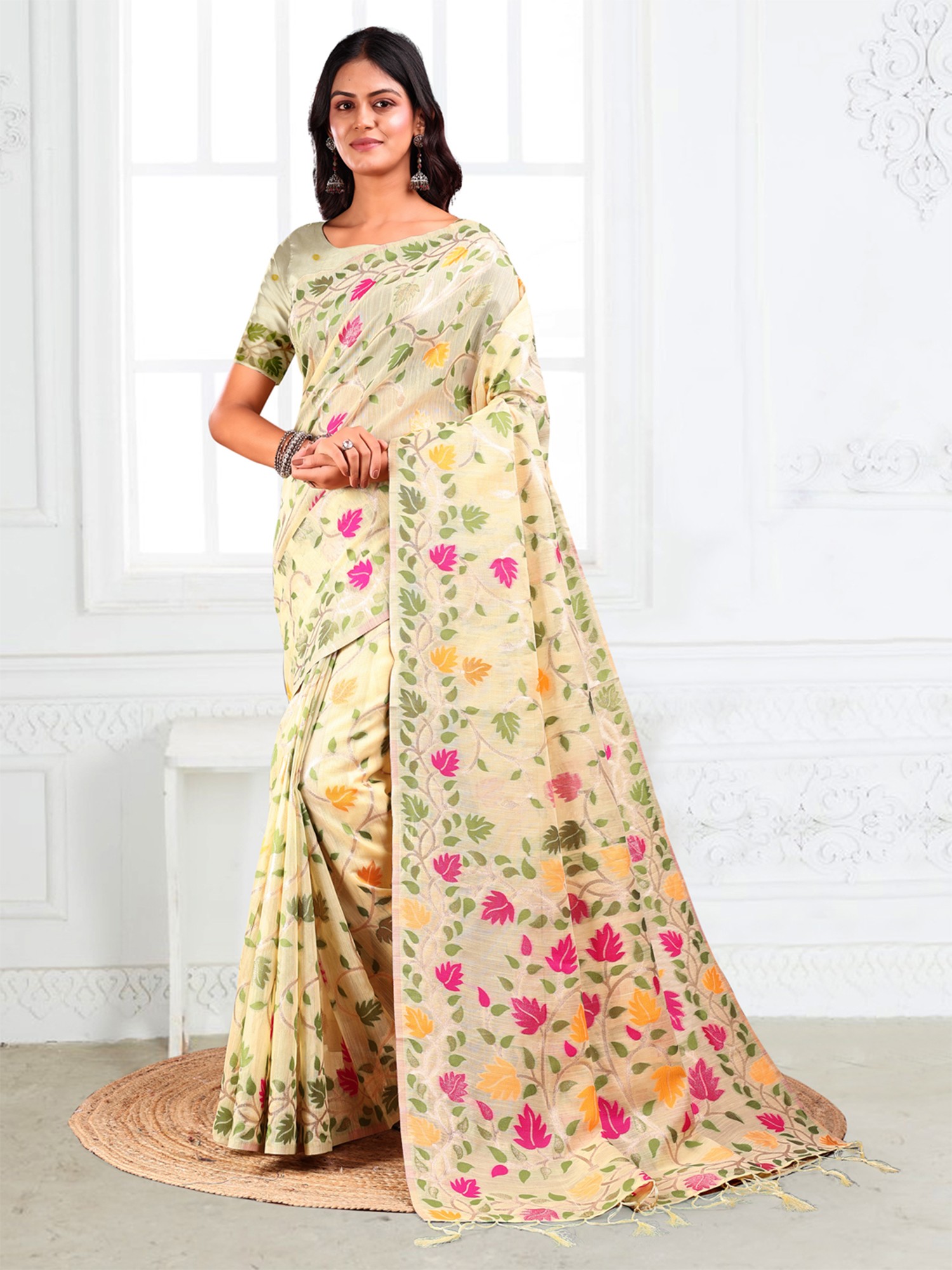 Traditional Linen Cotton Woven Zari Worked Saree with Tassel Pallu for Women