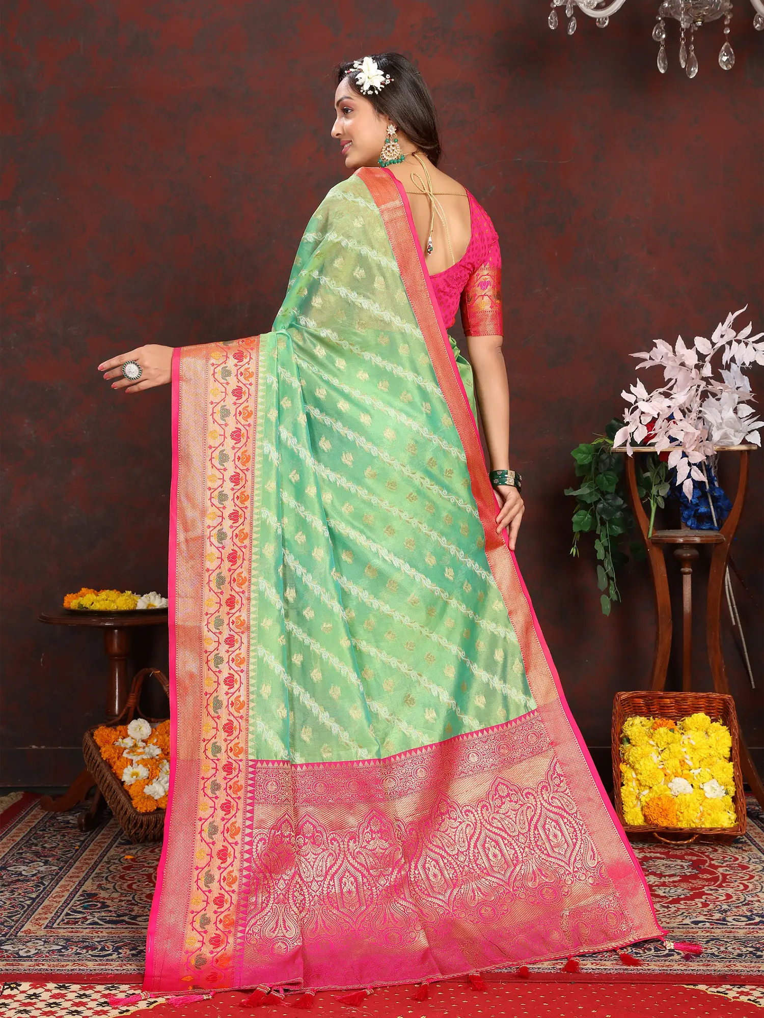 This saree is more than just an attire; it's an heirloom. The combination of the refreshing mint green and the striking fuchsia pink makes it a versatile choice for a multitude of occasions. Whether you are attending a wedding, a festive celebration, or a formal gathering, this saree is sure to make you stand out. Its luxurious silk texture drapes beautifully, accentuating your silhouette with effortless grace. The lustrous sheen of the silk catches the light, creating a mesmerizing glow that enhances its overall appeal.