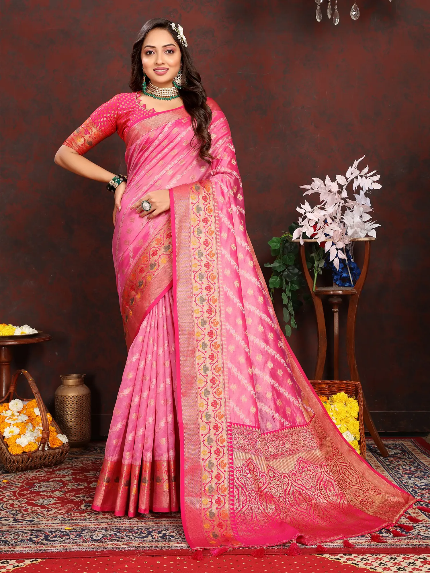Zari Woven Jaal Work Banarasi Silk Traditional Saree With Contrast Tassels Pallu