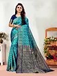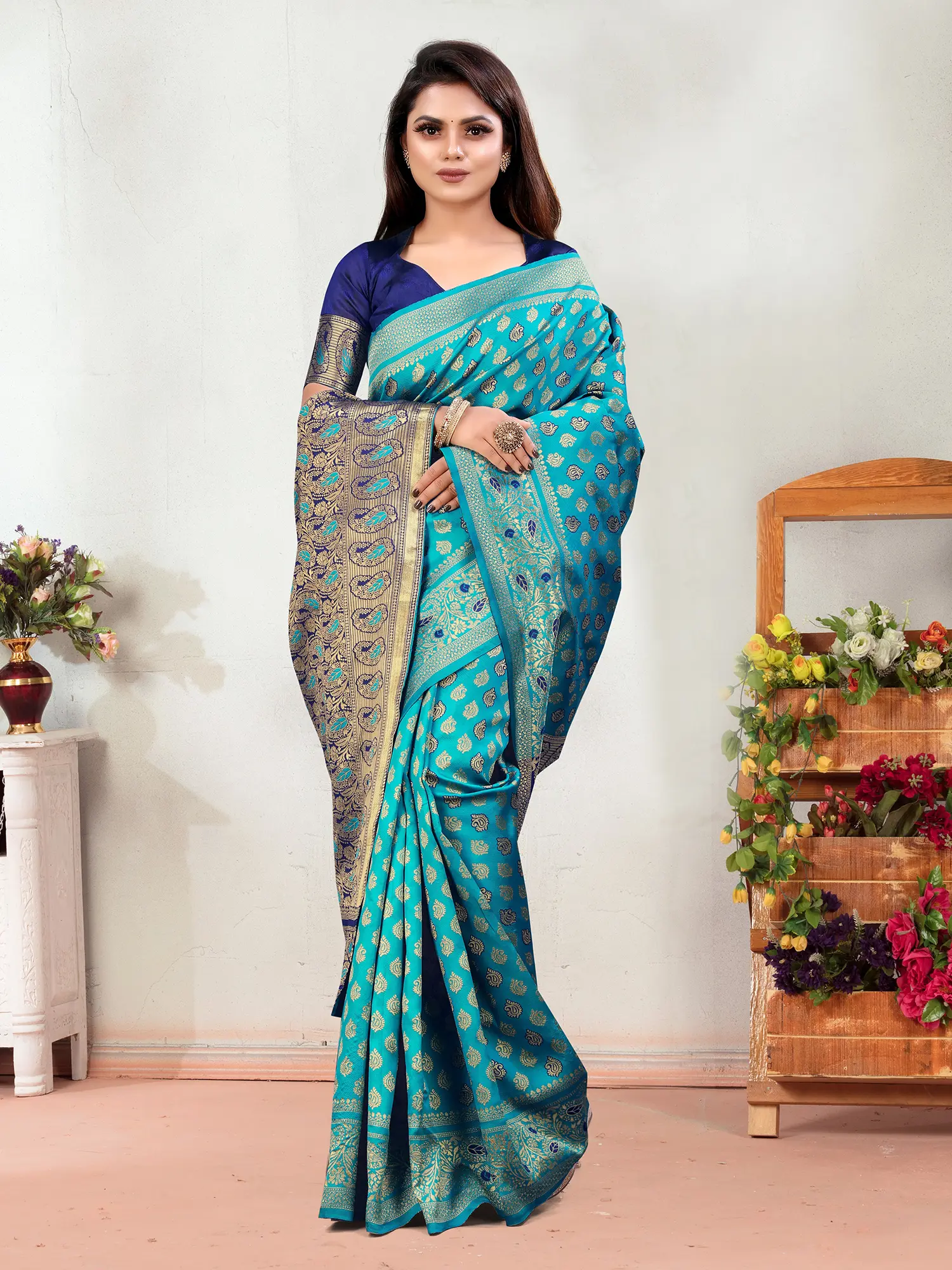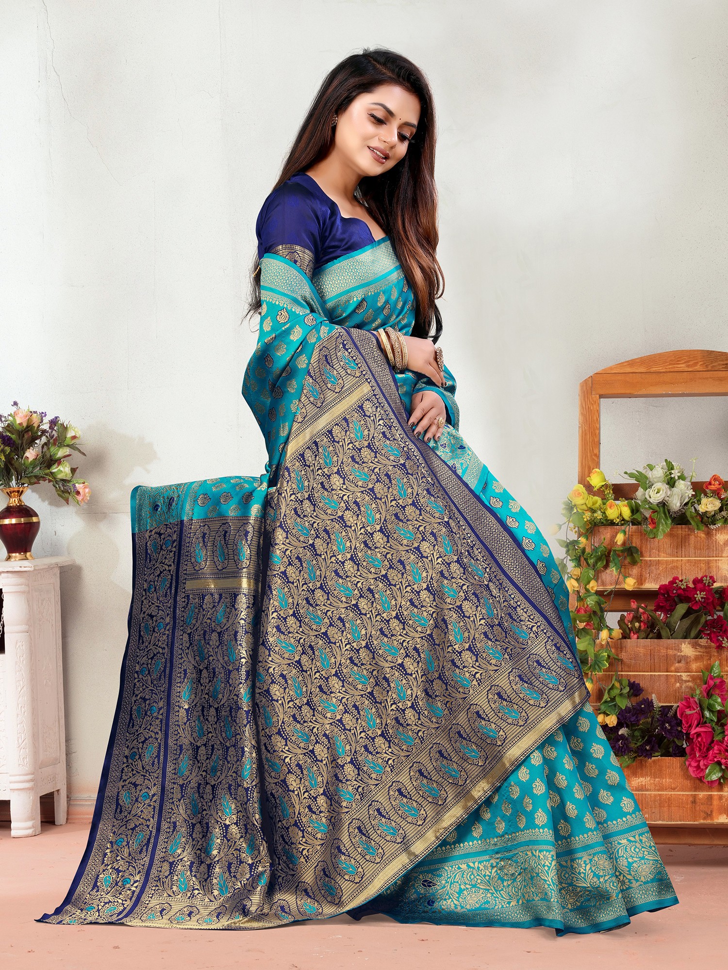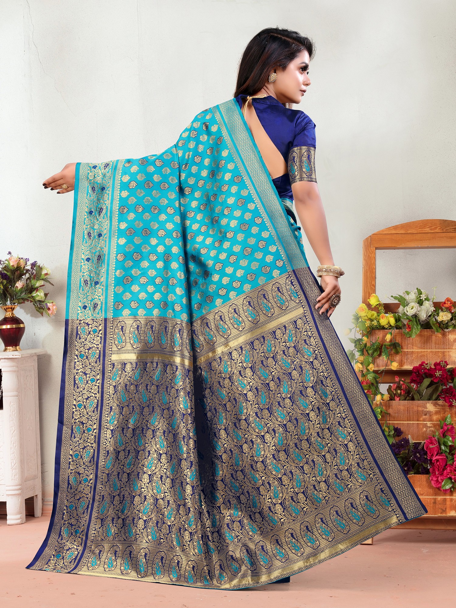 The true splendor of this saree lies in its expansive borders. A generously wide border, adorned with classic paisley motifs in a striking contrast of deep navy and shimmering gold, frames the vibrant turquoise body. This bold band of embellishment adds a regal touch, drawing the eye and emphasizing the saree's inherent elegance. The pallu, the most exquisite part of any saree, is a masterpiece in itself. Woven with a rich tapestry of golden threads, it features a complex design that complements the border, creating a harmonious flow of patterns and colors. This woven contrast ensures that the pallu stands out, making a powerful statement with every graceful drape.
