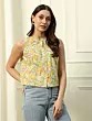Embrace the vibrancy of the season with this charming sleeveless top. Adorned with an all-over floral print in a delightful palette of yellows, greens, and subtle lilac hues, this piece is designed to bring a touch of sunshine to your wardrobe. The lightweight cotton fabric ensures breathability and comfort, making it perfect for warm weather days and nights. The top features a classic round neckline that leads to a delicate button-down front, allowing for adjustable styling. The sleeveless design enhances its airy feel, ideal for layering or wearing on its own. The playful floral pattern adds a touch of femininity, while the structured silhouette keeps it modern and chic.