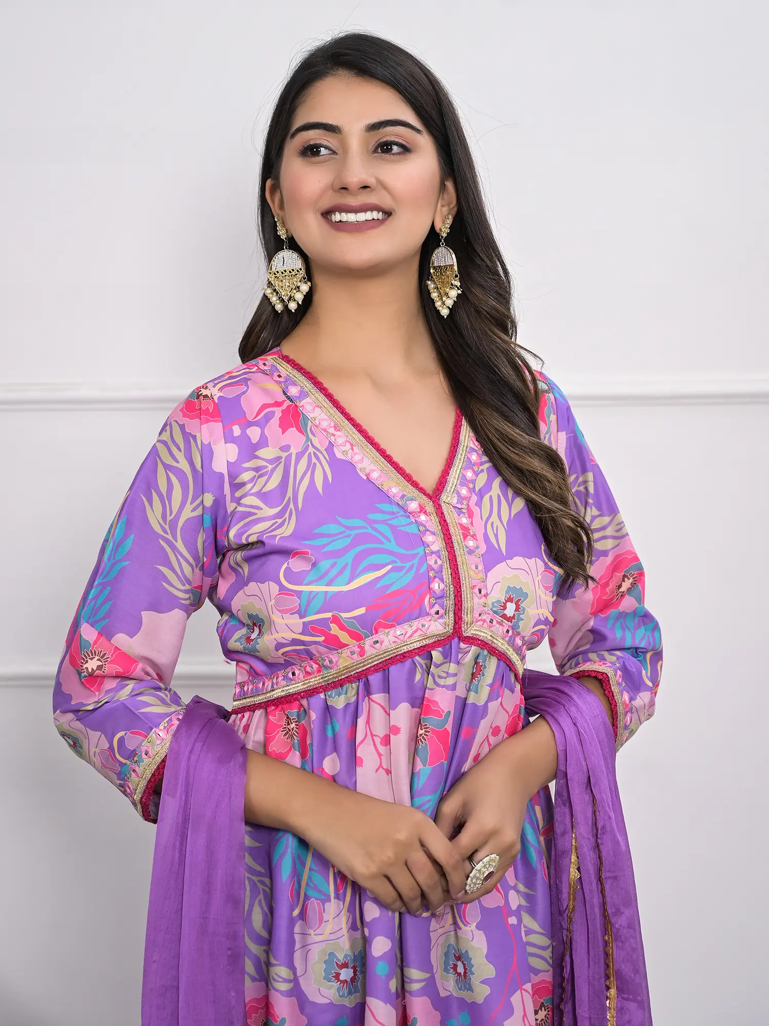Fully Flared Digital Floral Print Attractive Anarkali Festive Wear Pure Muslin Kurti And Bottom With Dupatta