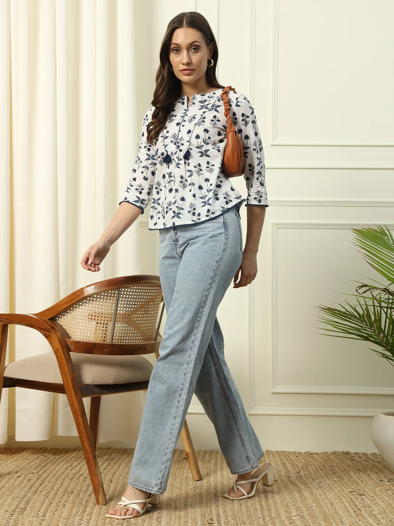 This top is incredibly versatile and can be styled in a variety of ways to suit your personal taste and the occasion. For a casual daytime look, pair it with your favorite denim jeans or shorts and some comfortable sandals or sneakers. Add a crossbody bag and some simple jewelry for an effortlessly chic ensemble. For a more dressed-up look, consider pairing it with a skirt or tailored pants. High-waisted bottoms will accentuate your waist and create a flattering silhouette. Finish the look with heels or wedges and some statement earrings. A clutch or small handbag will complete the ensemble. Don't be afraid to experiment with accessories. A delicate necklace can enhance the V-neckline, while a scarf or wrap can add a touch of warmth and style. A belt can also be used to cinch in the waist and create a more defined shape.