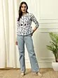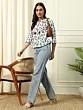 Three Piece Set Cotton Multicolor Kalka Printed Long Jacket With Silver-Grey Satin Crop-top And Pant