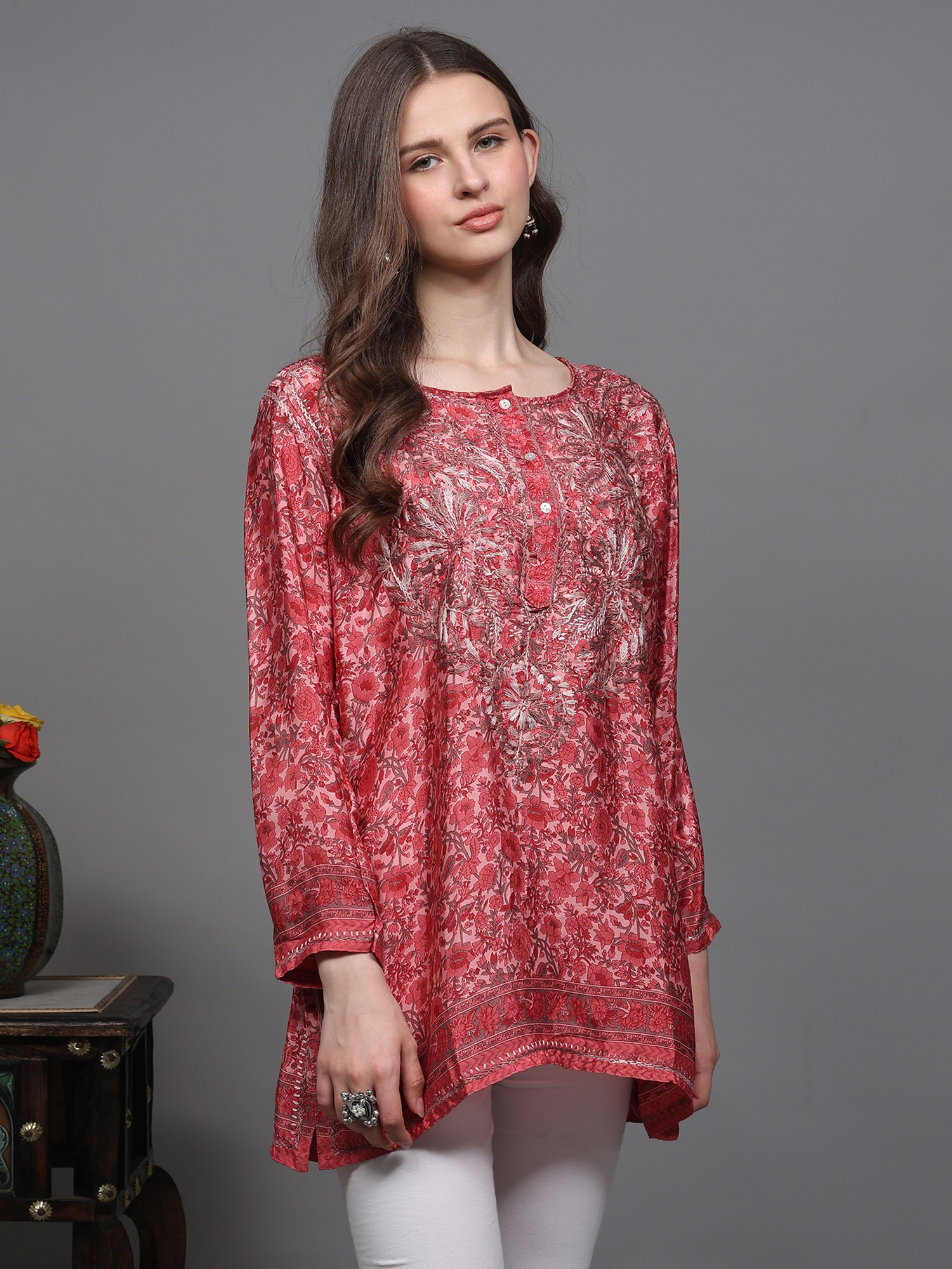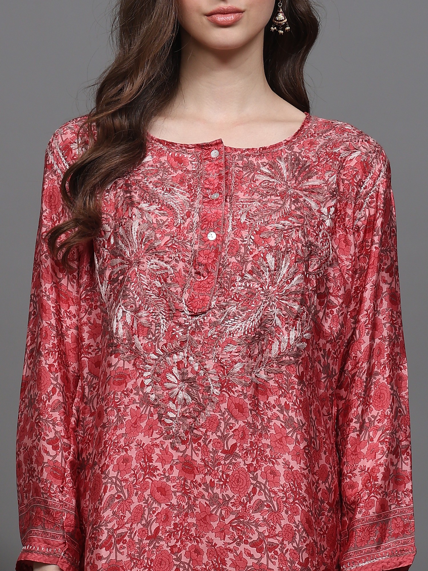 Floral Printed Crepe Straight Kurti with Chikankari Embroidery