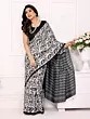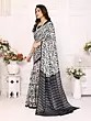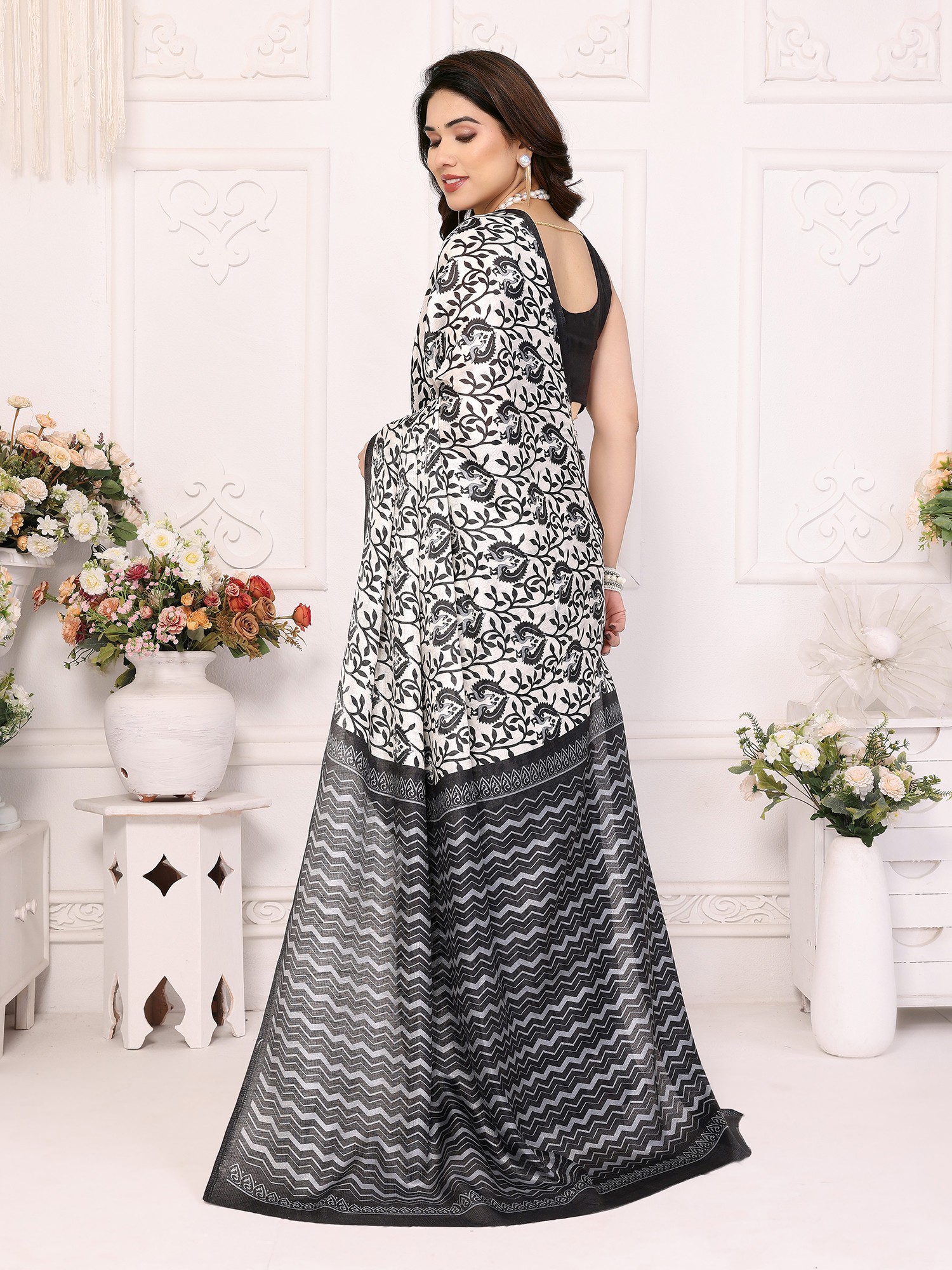 This saree is a celebration of intricate design. The main body showcases a delicate floral print, creating a harmonious blend of nature-inspired artistry. Each petal and leaf is carefully rendered, offering a visual feast that's both captivating and soothing. The pallu takes on a bold zig-zag pattern, injecting a modern edge into the traditional silhouette. The contrasting designs create a beautiful interplay, making this saree a true work of art.