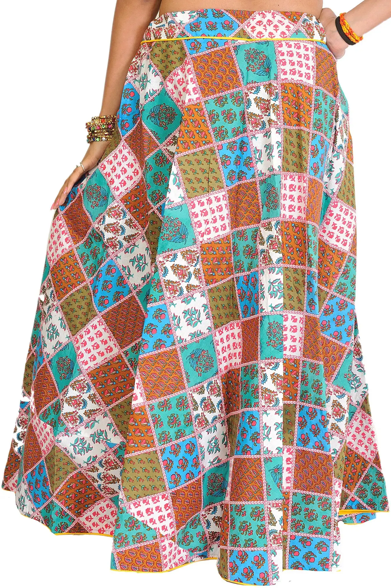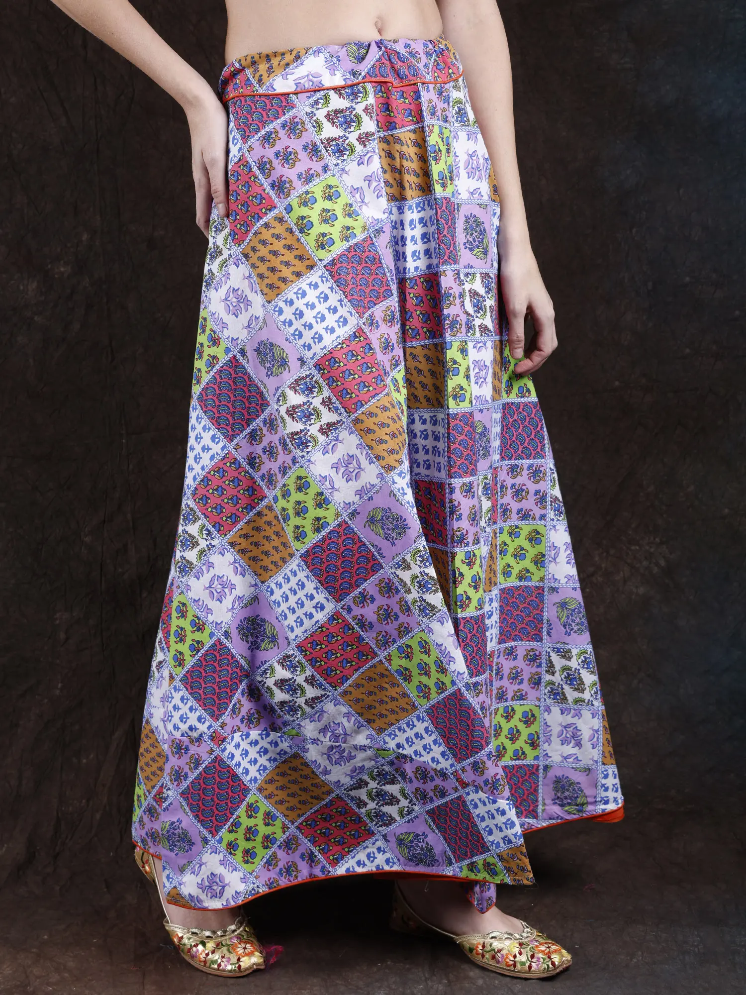 Comfort and artistry come together beautifully in this long patchwork skirt, which is adorned with piping and floral print. This skirt is made entirely of cotton and has a beautiful patchwork design combined with colourful flowers to create a visually stunning symphony. The delicate piping pattern adds an air of refinement, making it more charming. This skirt is appropriate for both formal and casual occasions since it is so unique and free-spirited. This multi-purpose accessory will let you show off your own sense of style from day to night.