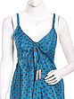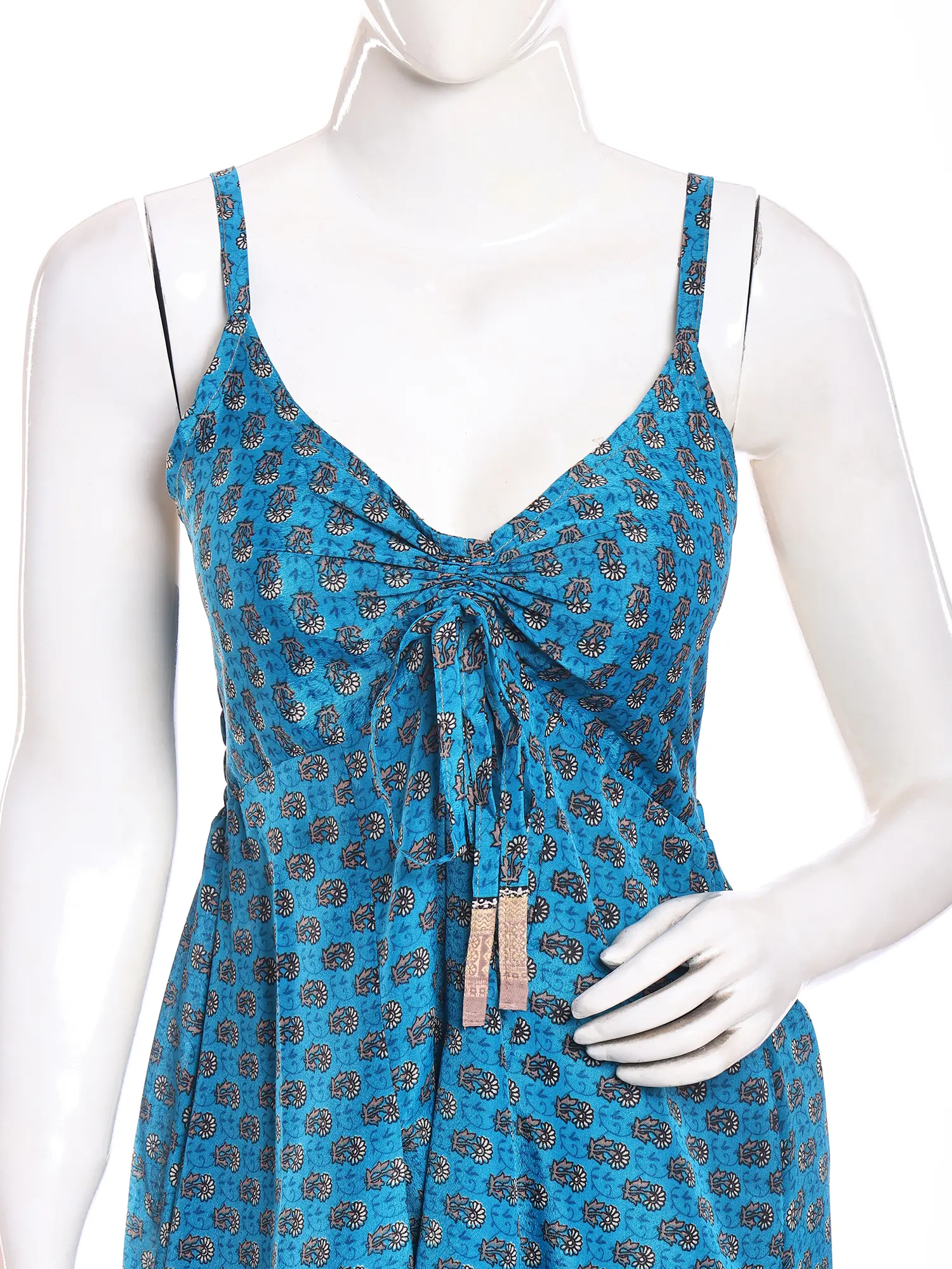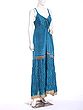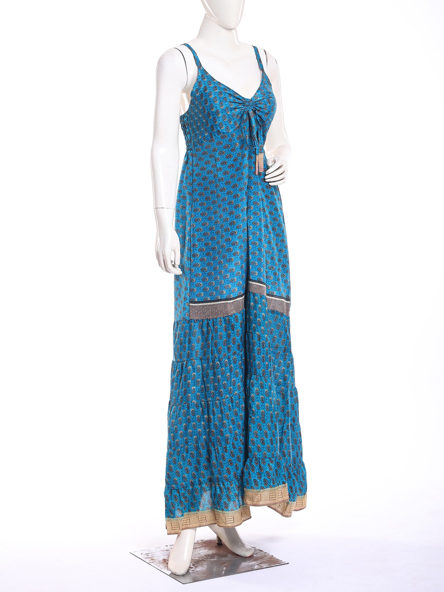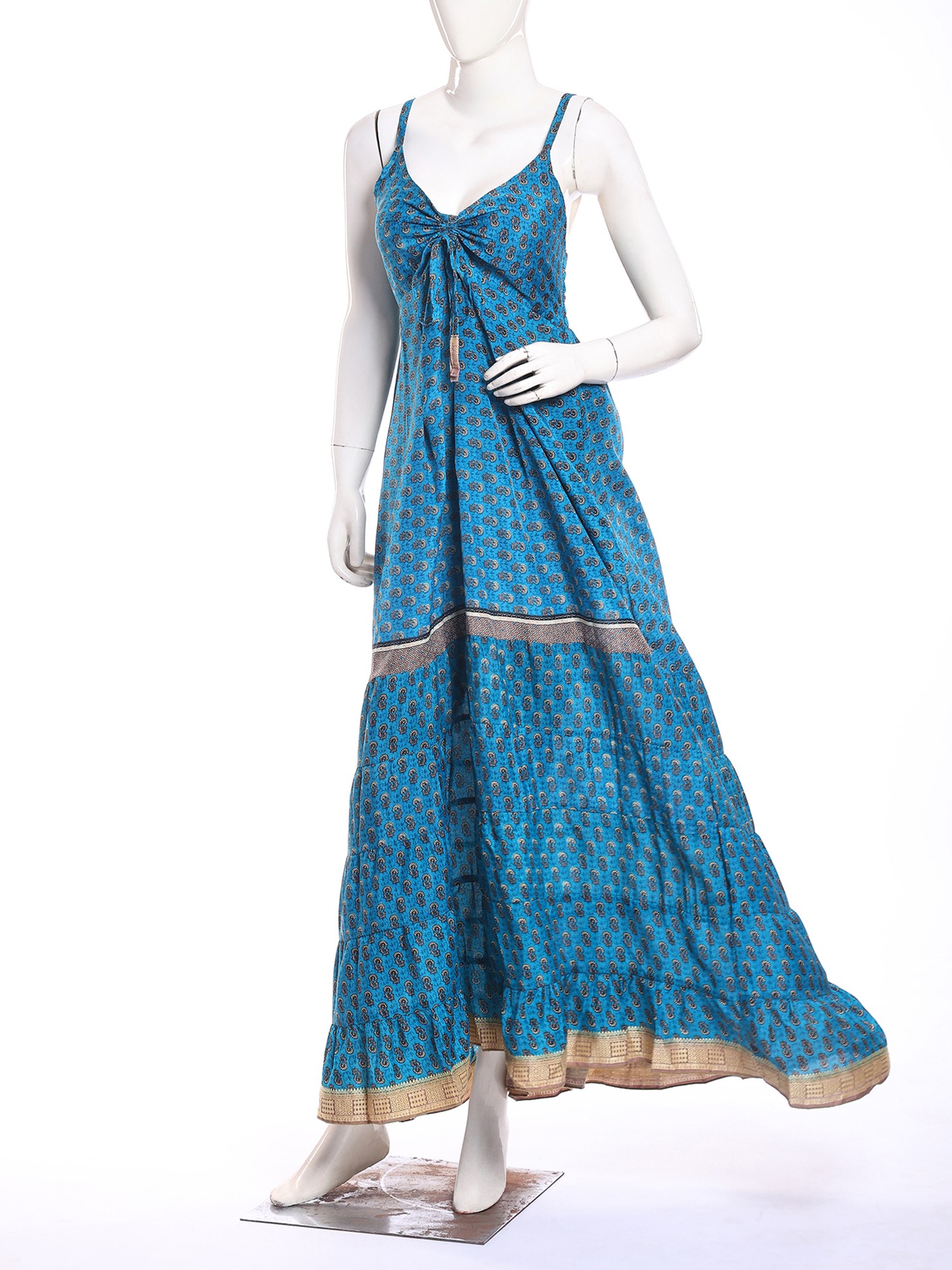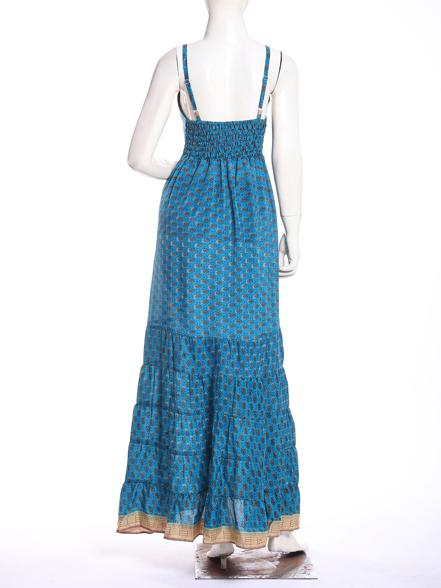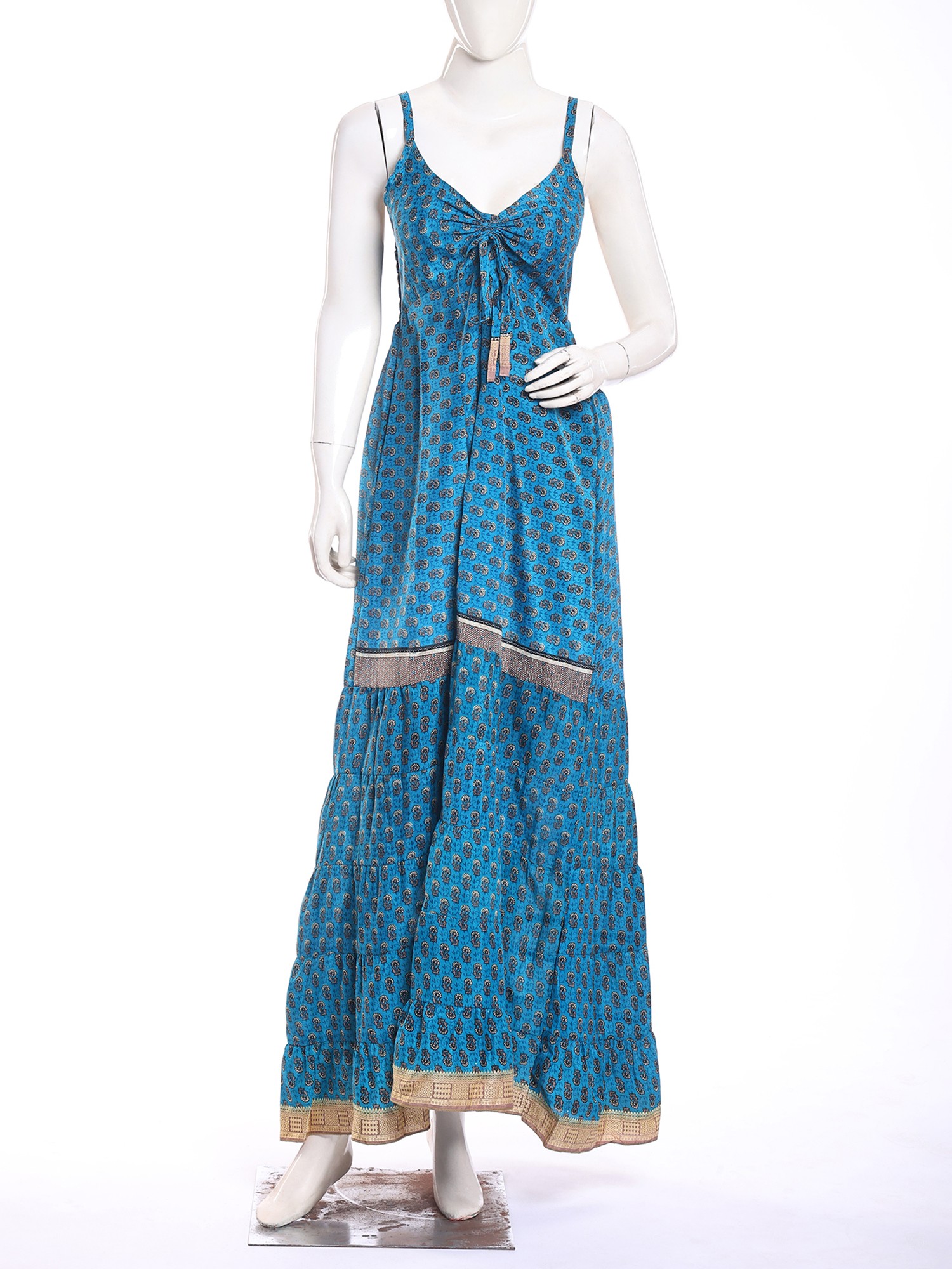 The captivating design features delicate spaghetti straps that lead to a gracefully tied bodice, creating a flattering and feminine neckline. A subtle, intricate paisley-inspired print adorns the vibrant blue silk, its pattern reminiscent of ancient motifs. Bands of subtle, shimmering fabric interrupt the tiers of the flowing skirt, adding a sophisticated touch and enhancing its graceful movement. You'll delight in the way the fabric cascades, creating a silhouette that is both comfortable and remarkably elegant, perfectly complementing a bust of 32 inches and a flowing length of 50 inches.