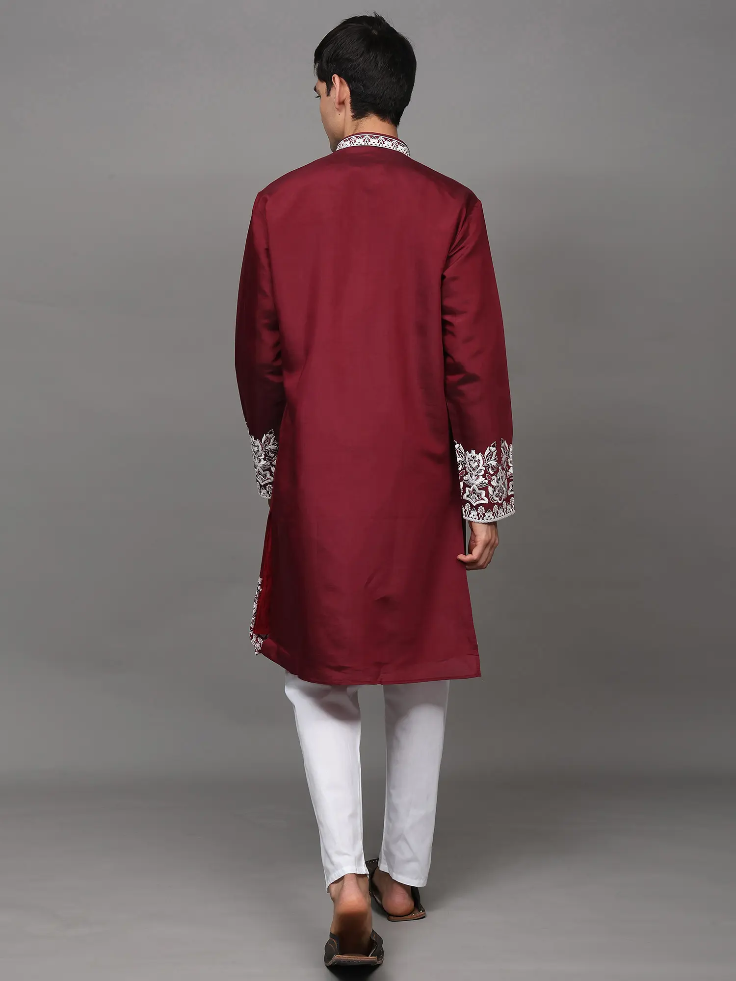 Step into a world of refined style with this exquisite Kurta Pajama set. A perfect fusion of traditional craftsmanship and contemporary design, this outfit exudes sophistication and grace. The rich, deep hue of the kurta serves as a striking canvas for the intricate floral thread embroidery, creating a visual masterpiece that's both eye-catching and subtly elegant. This is more than just clothing, it's a statement of your discerning taste.