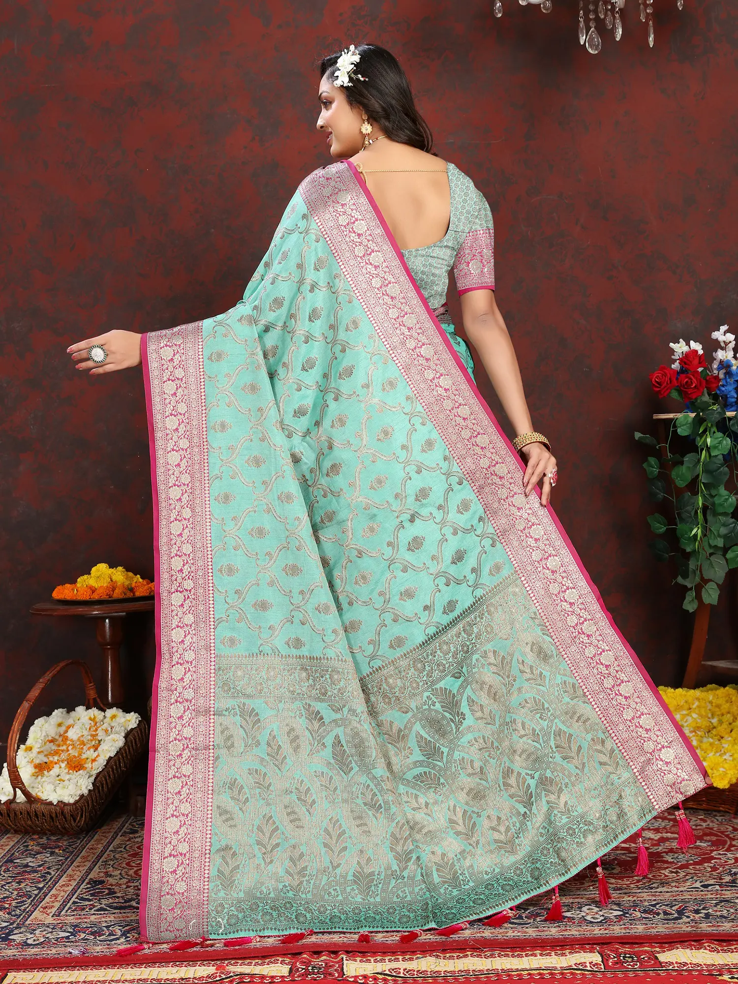 Beach-Glass Pure Silk Banarasi Saree with Zari Brocaded Floral Butta and Paisley Border