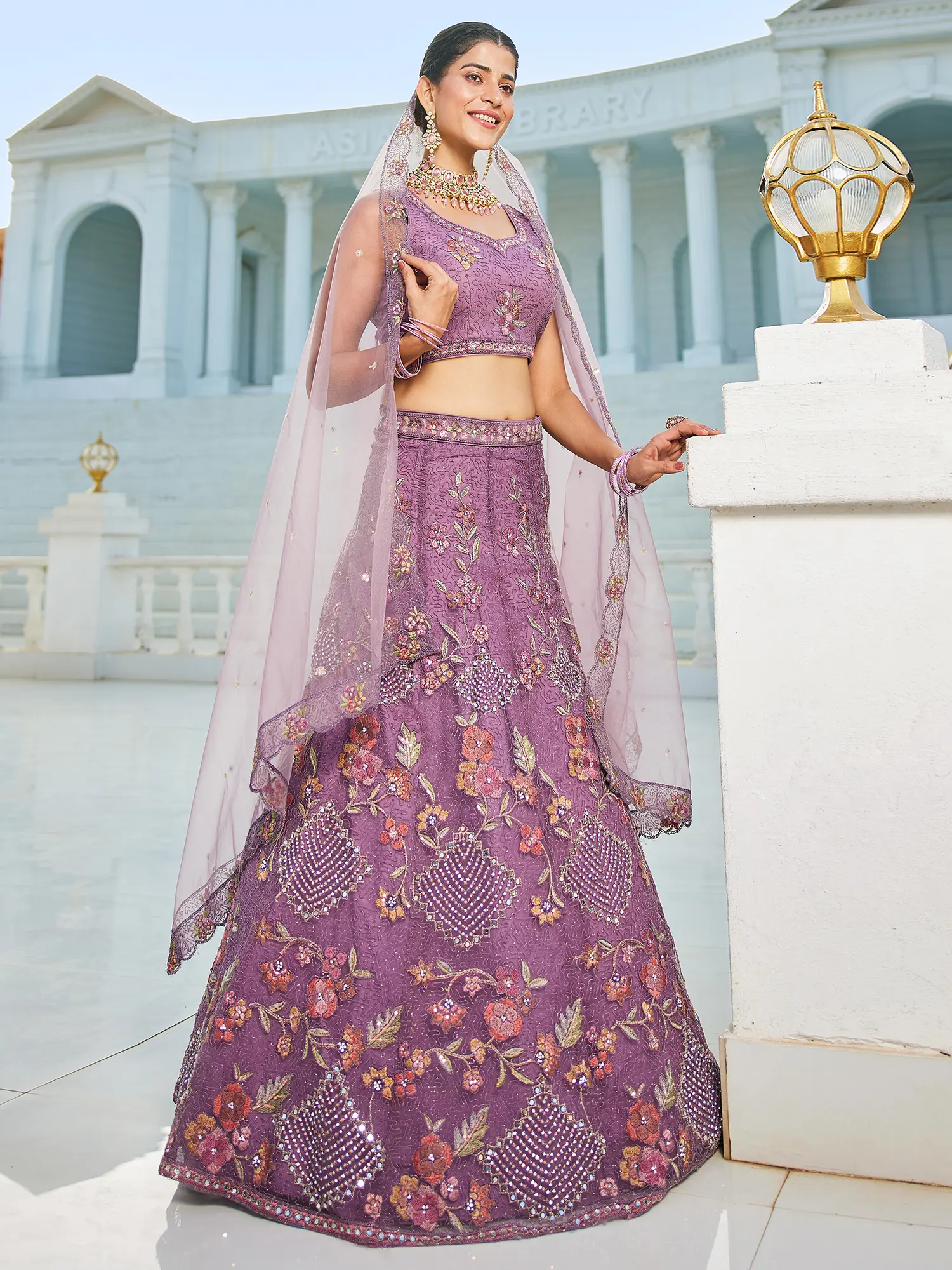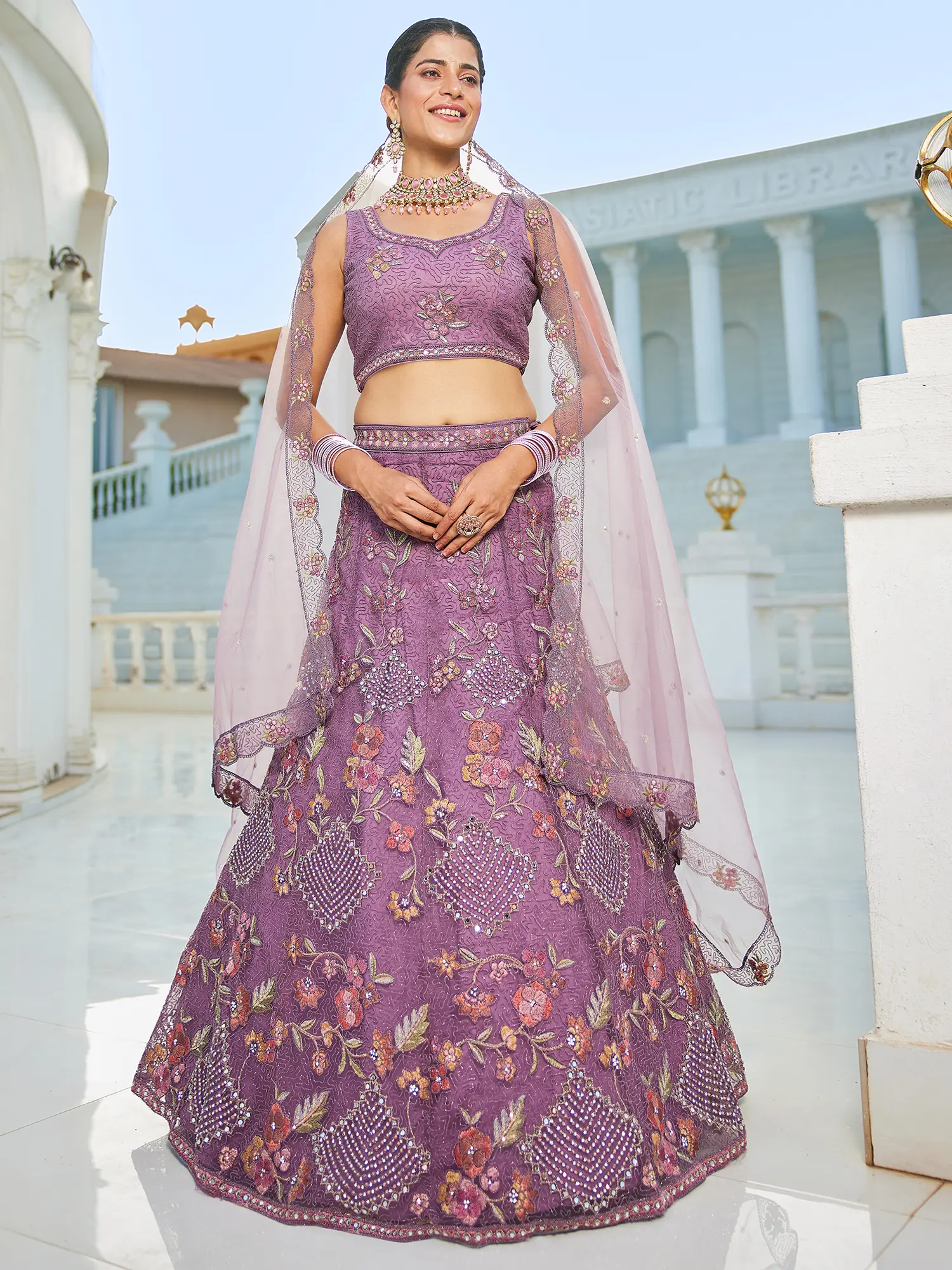 The ethereal quality of the net fabric provides a perfect canvas for the vibrant floral embroidery that adorns the lehenga and choli. You will appreciate the subtle interplay of textures, from the smooth sheen of the cording to the matte finish of the threads, all enhanced by strategically placed sequins that catch the light with every turn. The accompanying dupatta, also rendered in sheer net, is delicately embellished, creating a harmonious and graceful silhouette. This set, designed for a size 36, drapes beautifully, enhancing your natural form.