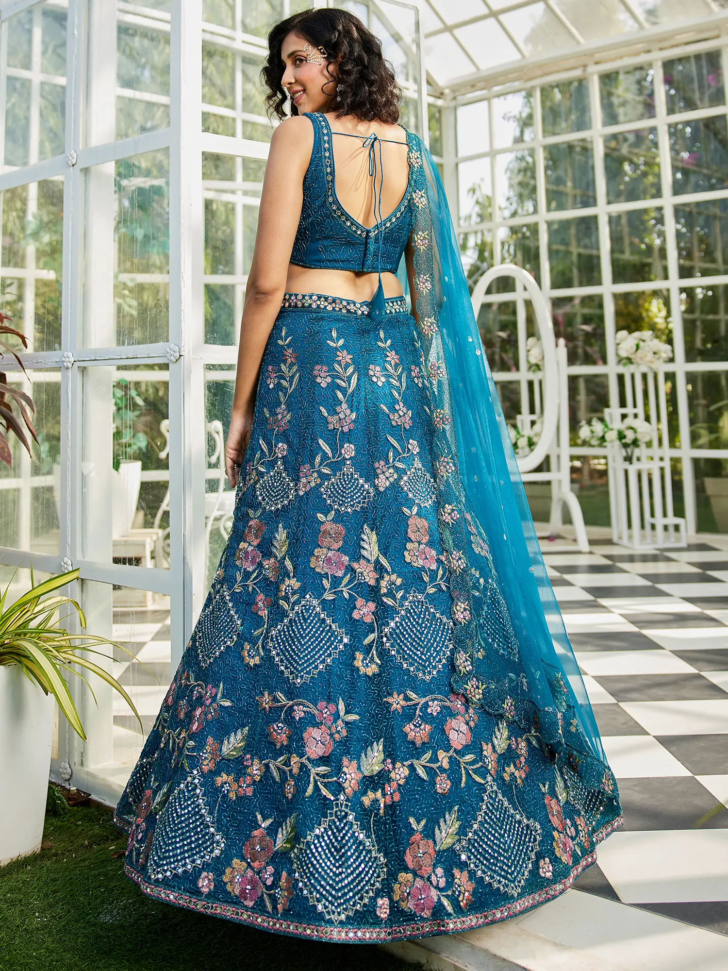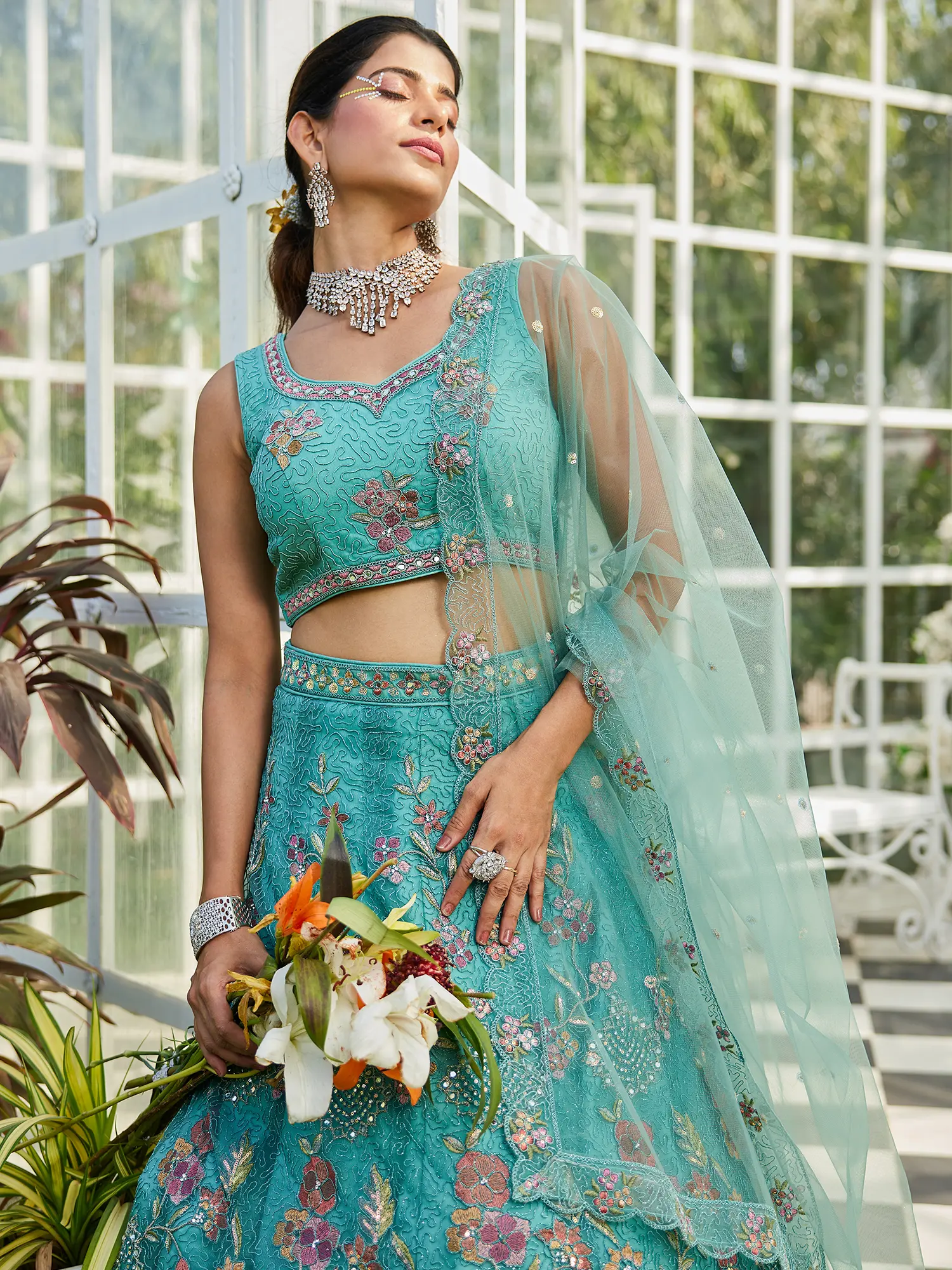 Teal Taffeta Silk Beautiful Floral Zari Embroidery Lehenga Choli with Beige Sheer Dupatta