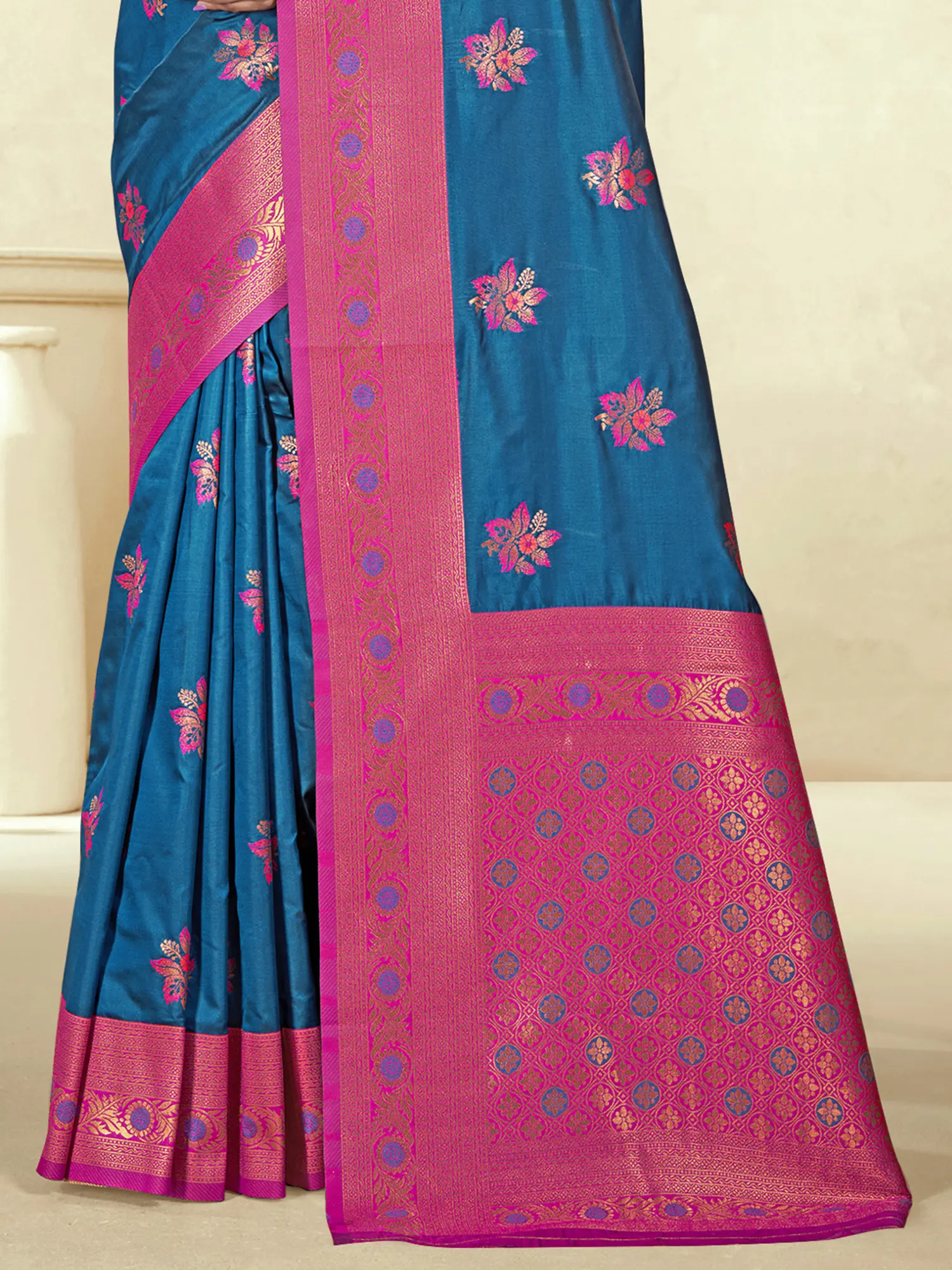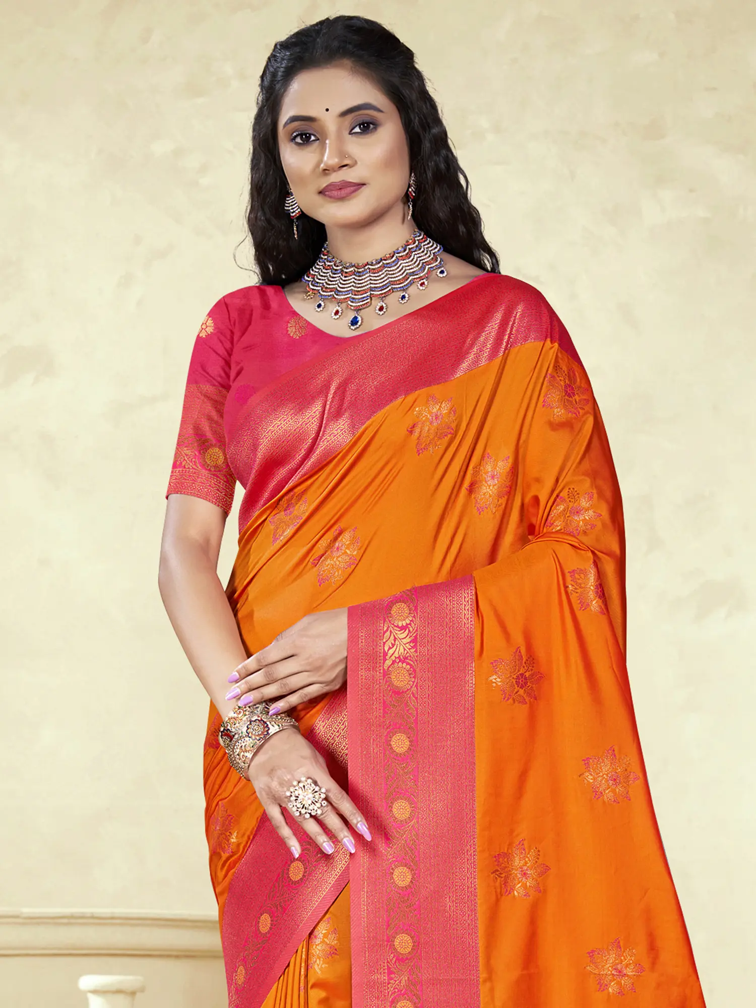 This saree effortlessly blends traditional craftsmanship with modern aesthetics. The classic design elements—the intricate floral motifs, the rich color palette, and the ornate pallu—combine harmoniously to create a look that's both timeless and contemporary. Whether you're attending a wedding, a festival, or any other special occasion, this saree is sure to make you feel confident and beautiful. It's the ideal choice for women who appreciate quality, detail, and unique style.