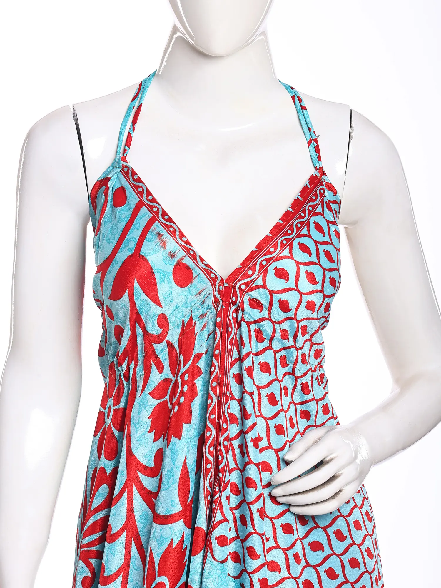 Adorned with a captivating print, this maxi-length creation is a testament to artisanal design. The eye-catching pattern, featuring a harmonious blend of sky blue and vivid red, flows seamlessly across the silk. Its halter neckline gracefully frames your décolletage, while the generous fifty-one inches of length create a dramatic, sweeping silhouette that elongates your form. The design ensures a comfortable fit, with a bust measuring thirty-six inches, designed to flatter.