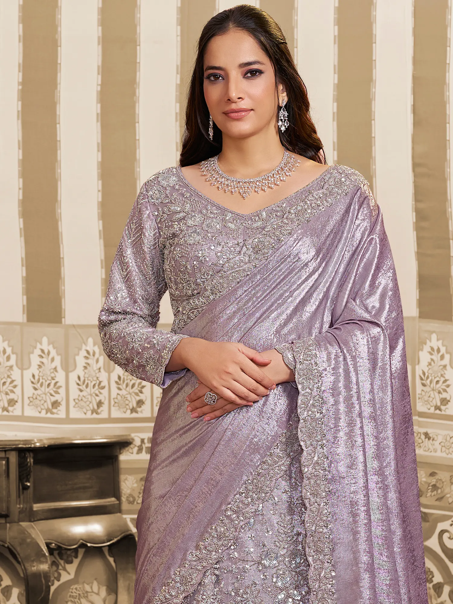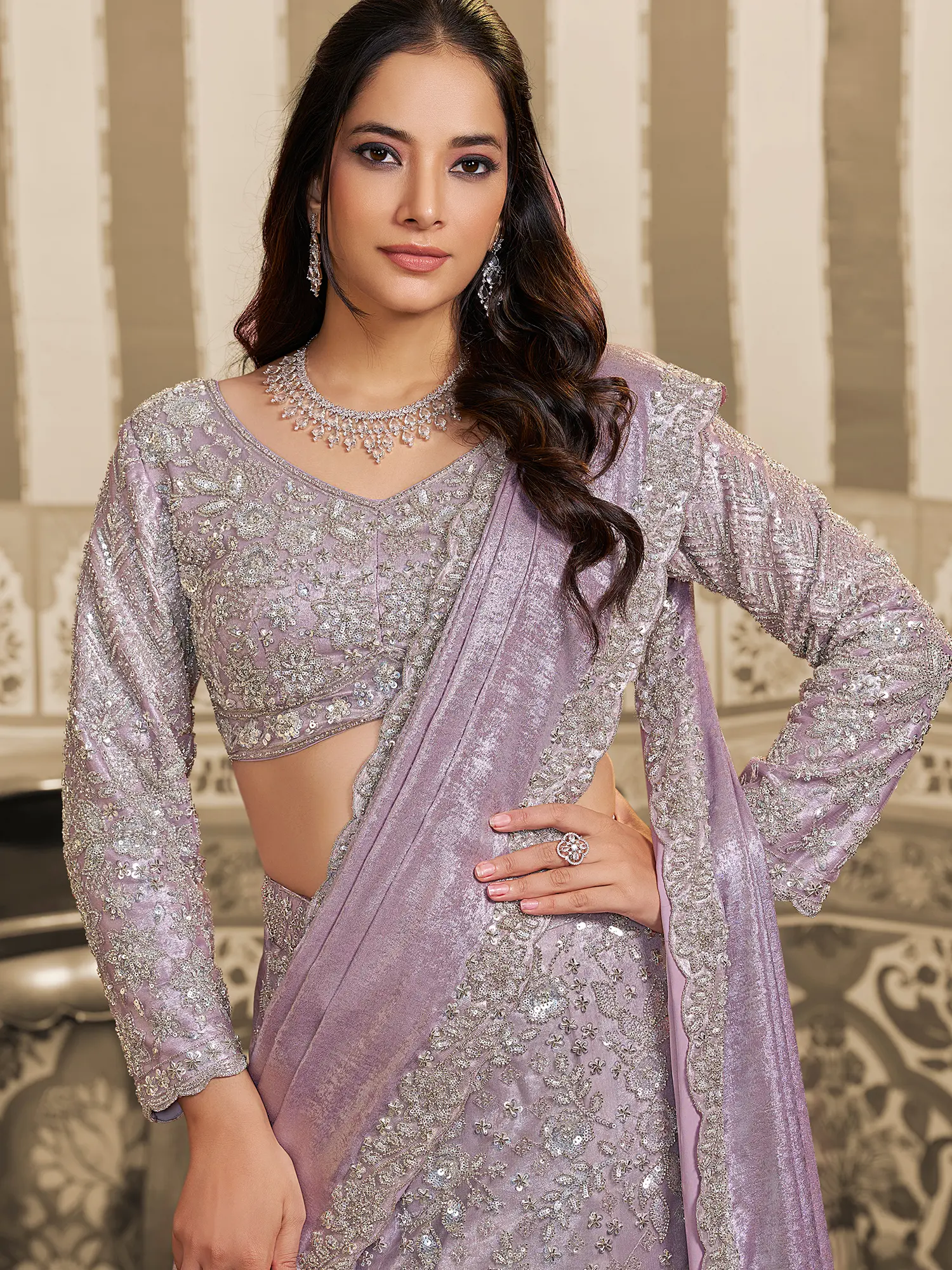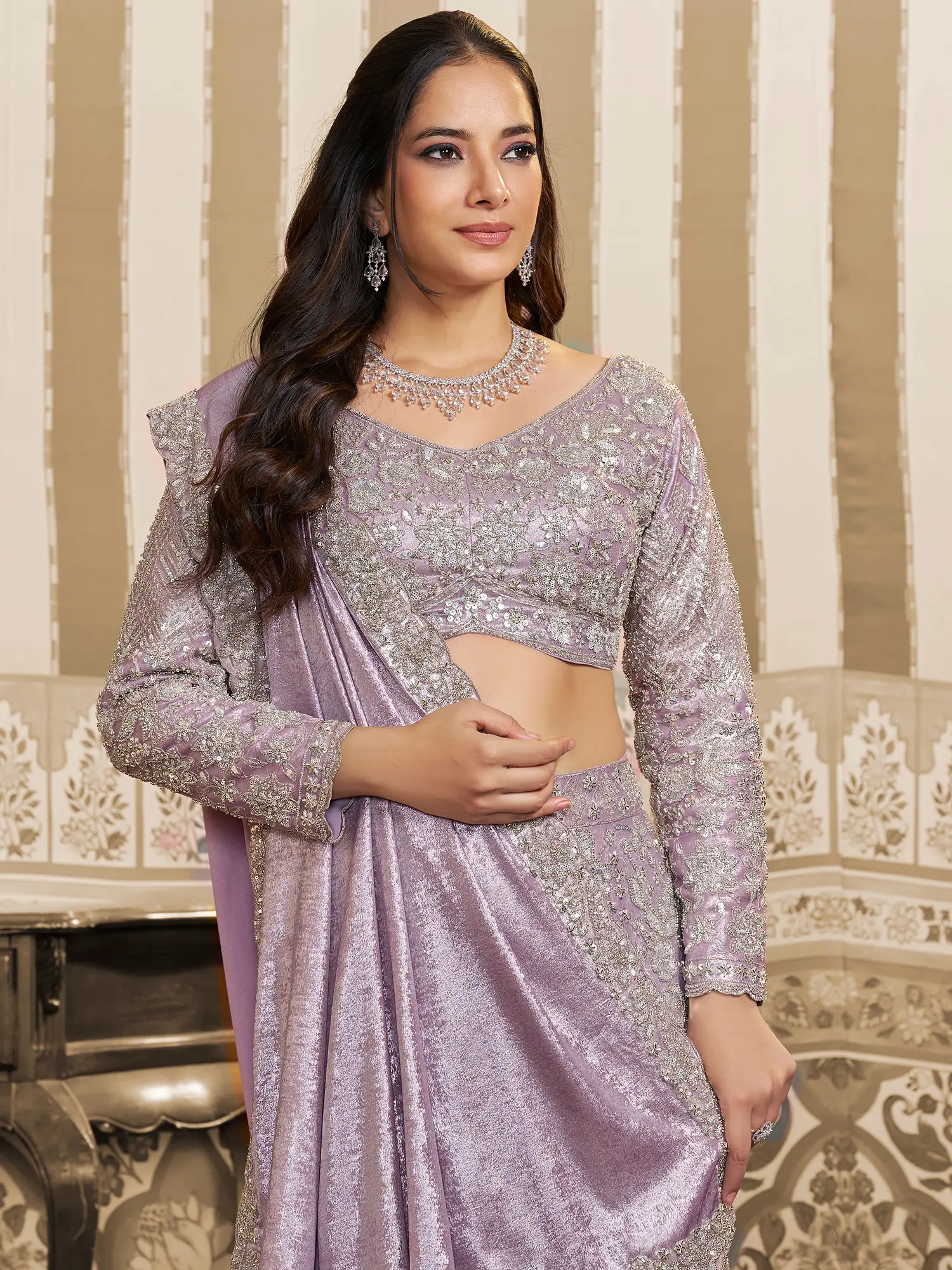 Step into a world of captivating elegance where luminous fabrics meet intricate craftsmanship. You'll find yourself the undisputed center of attention, radiating an aura of sophisticated charm and timeless allure. This ensemble is designed to make every celebratory moment an unforgettable spectacle.