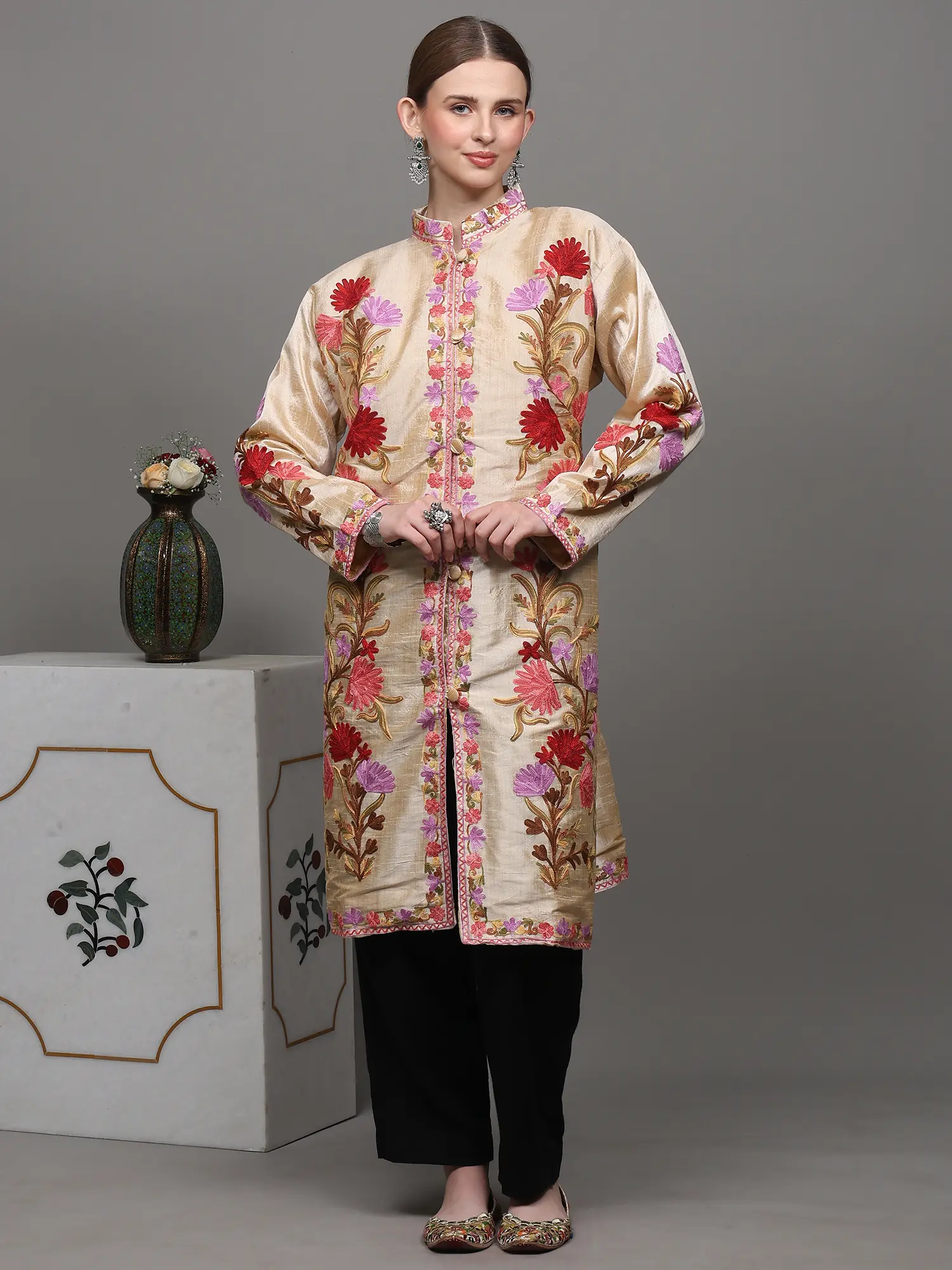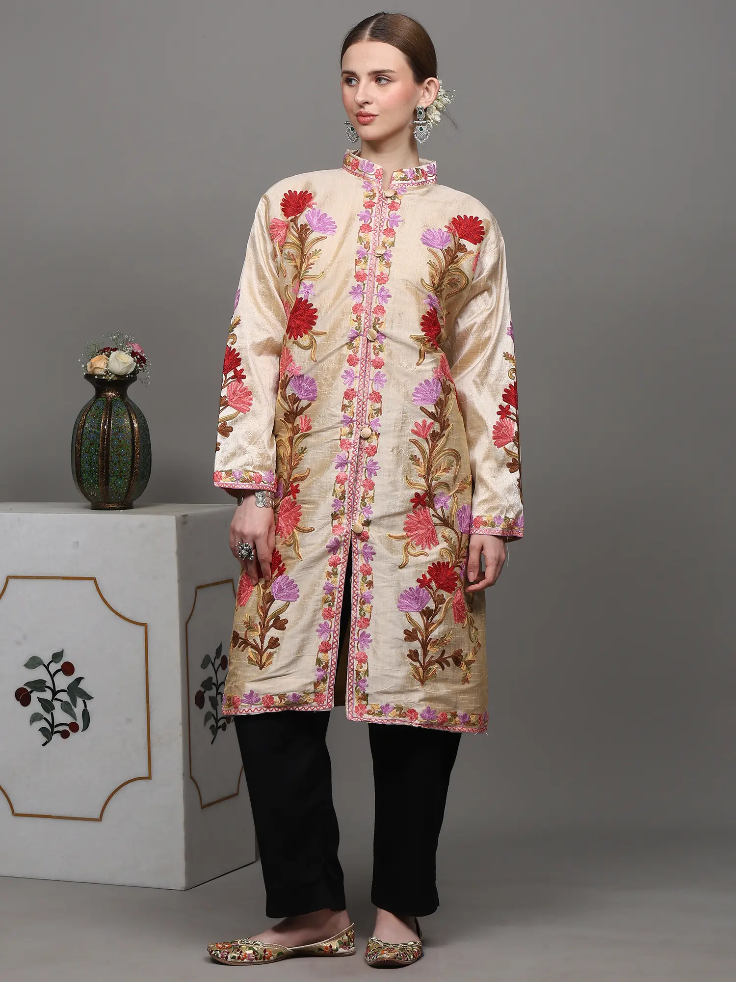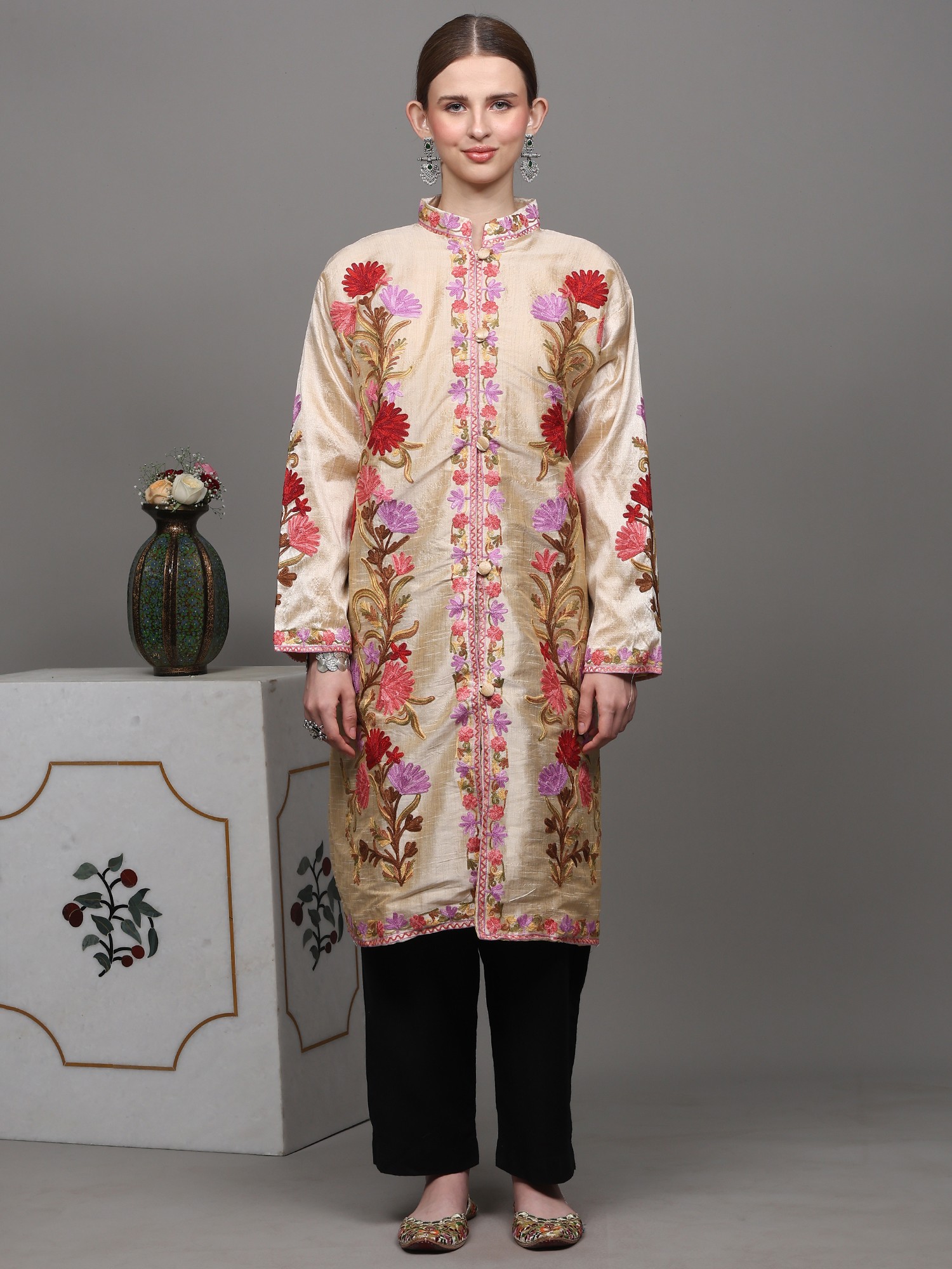 Neutral-Gray Long Kashmiri Jacket with Aari Hand-Embroidered Paisleys and Florals
