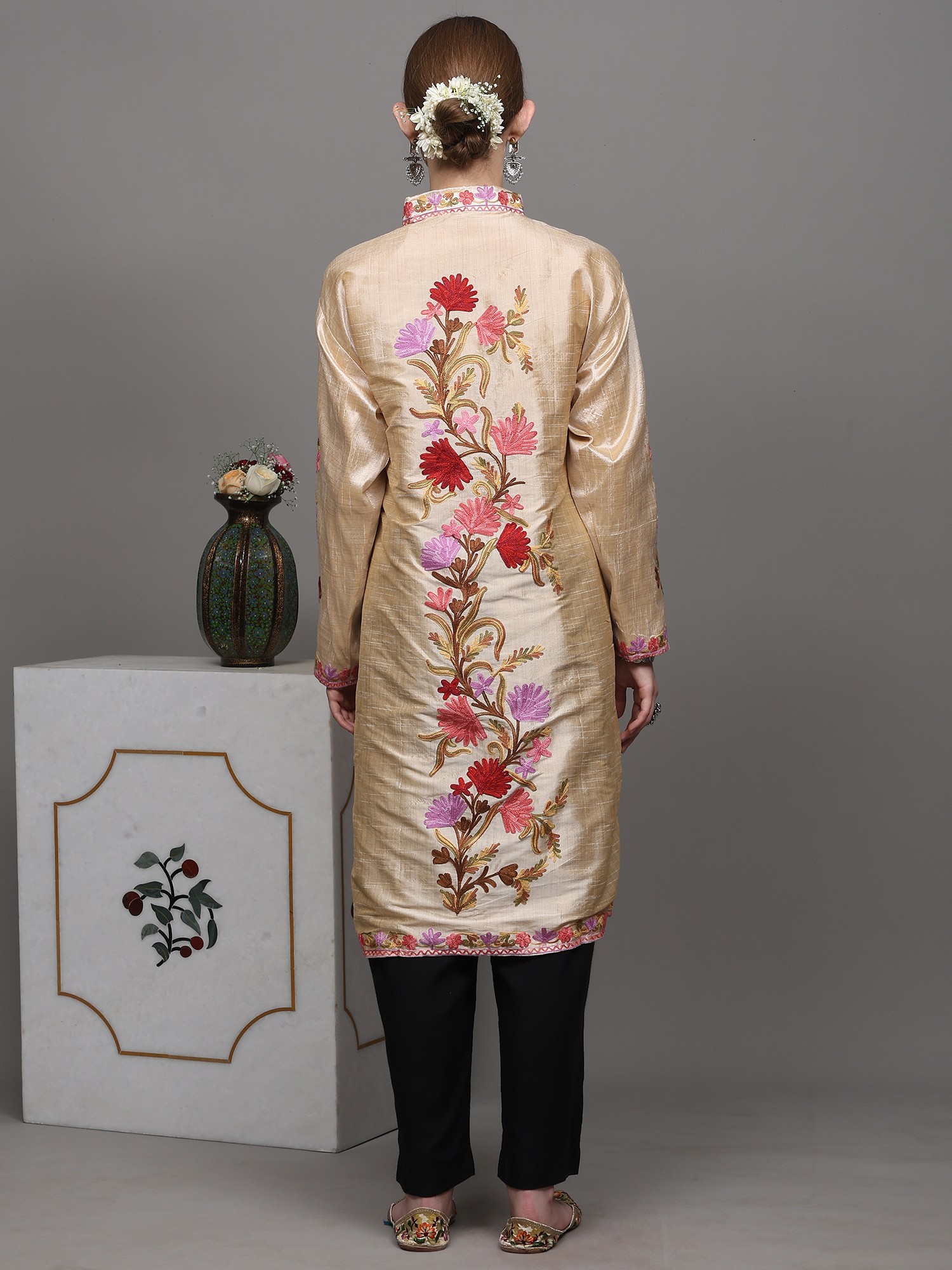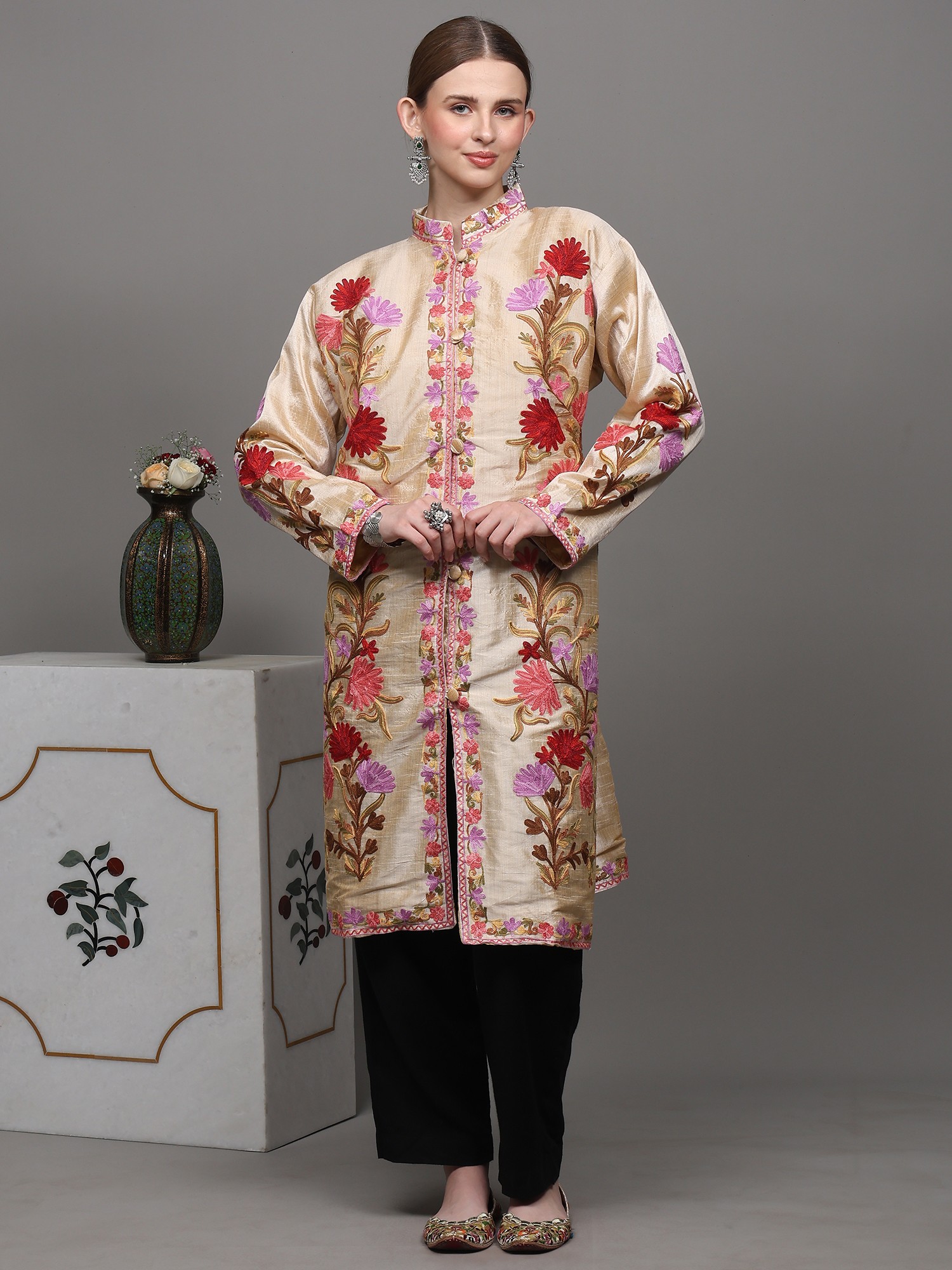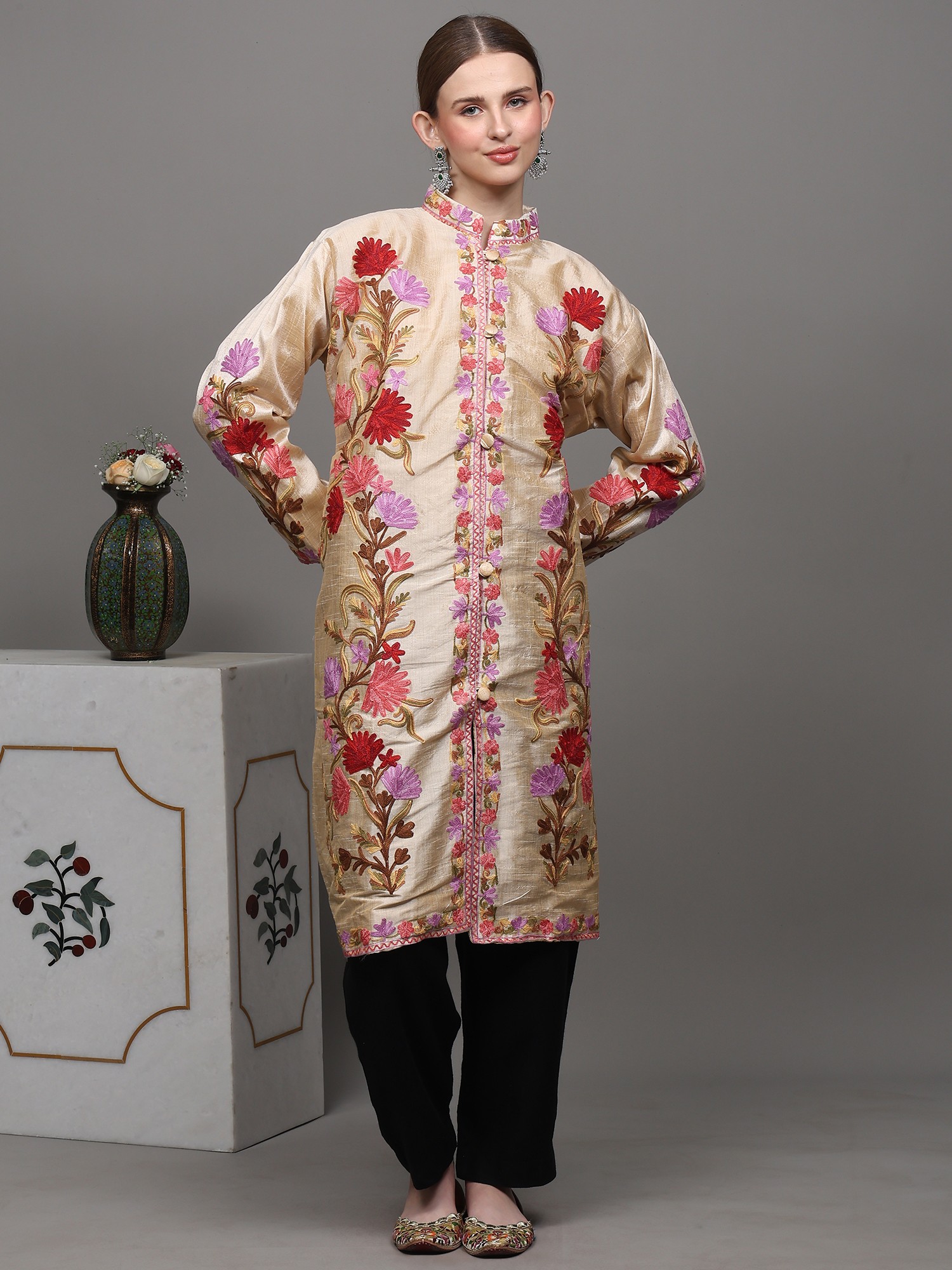 Neutral-Gray Long Kashmiri Jacket with Aari Hand-Embroidered Paisleys and Florals