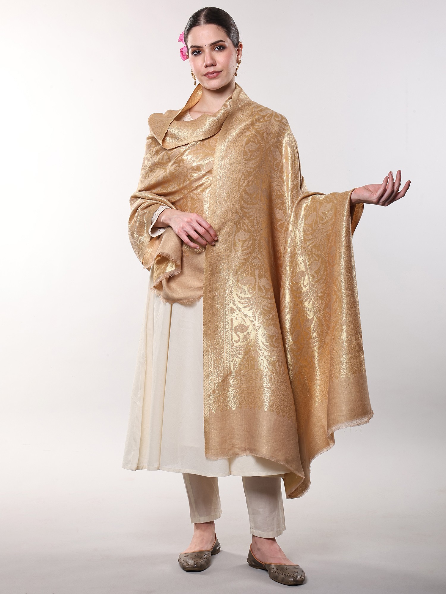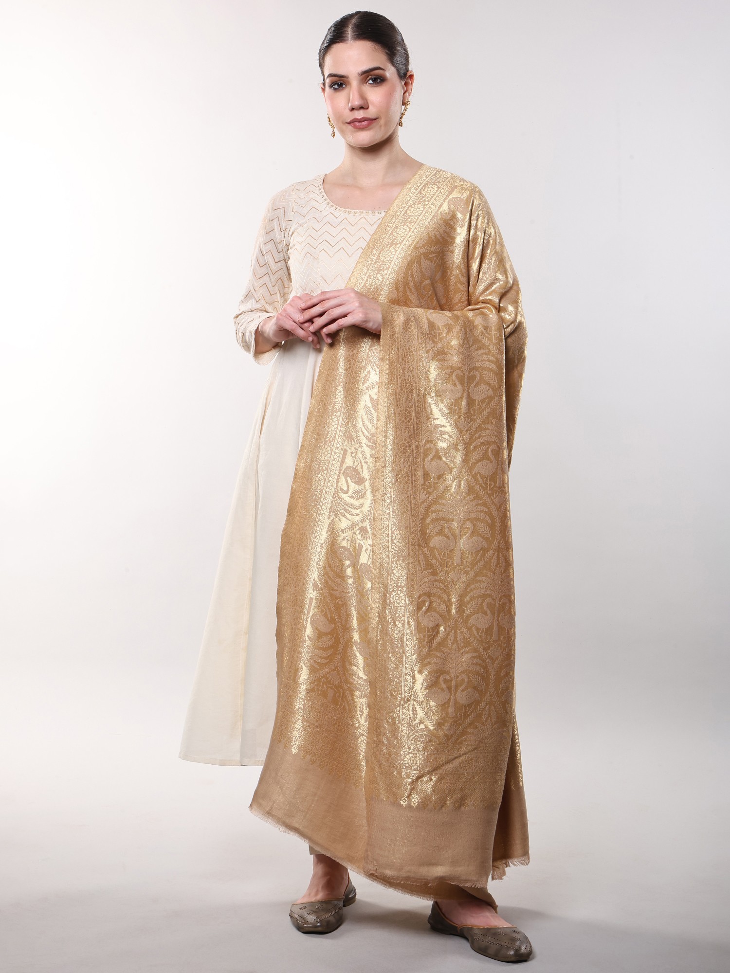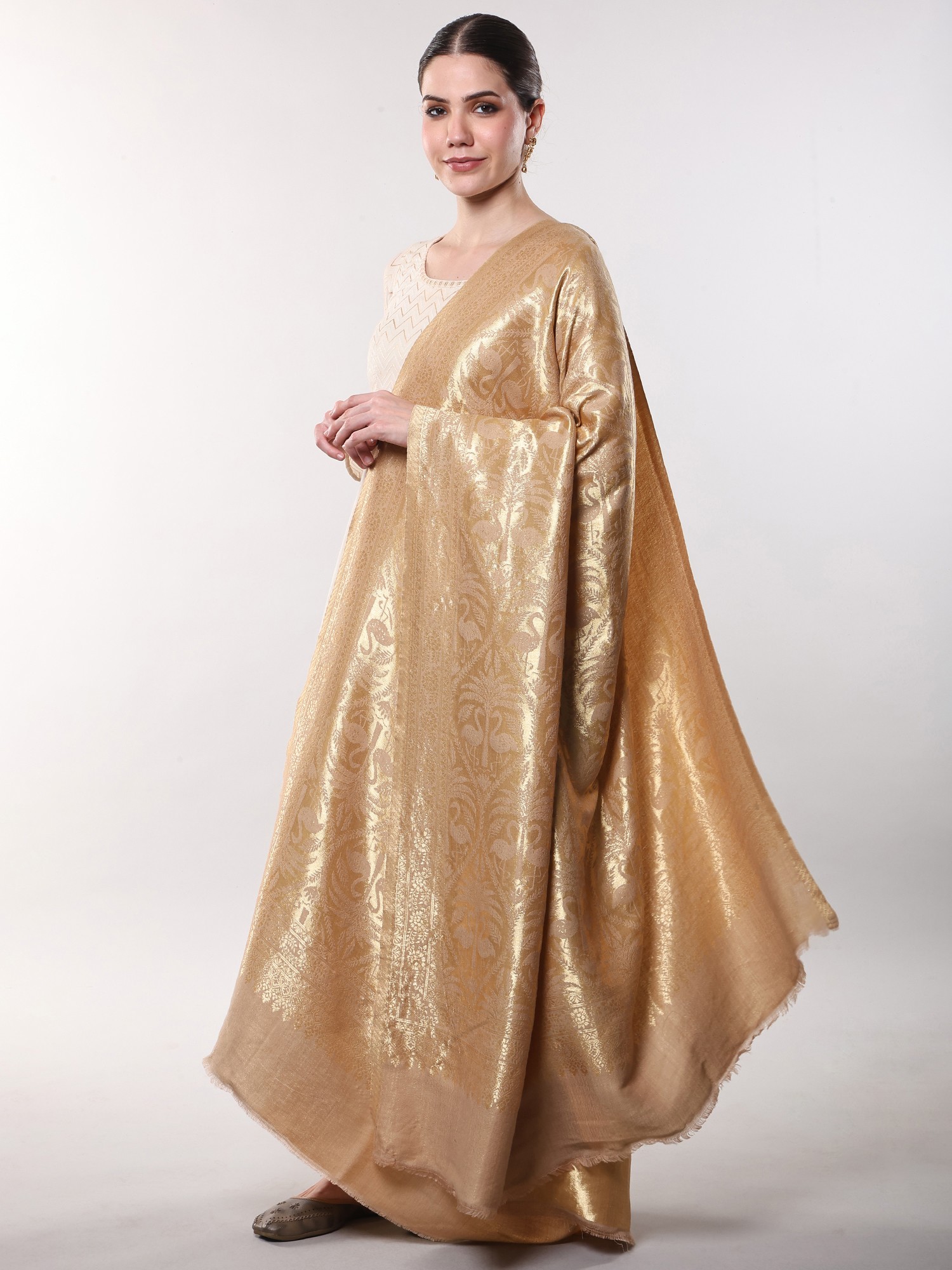Frosted-Almond Reversible Shawl with Zari Woven Flamingo and Tropical Palm