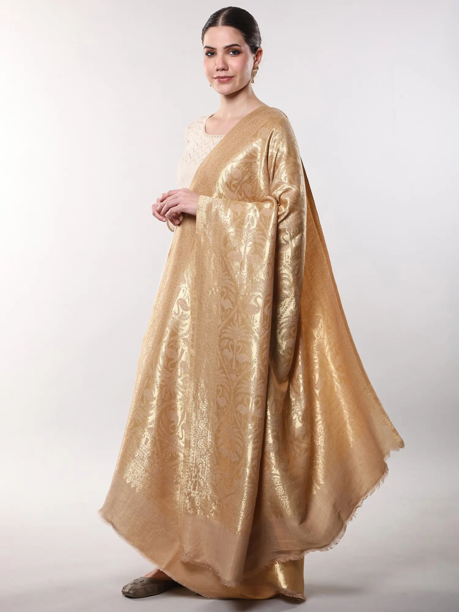 Drape this luxurious piece over a simple kurta for an effortless touch of glamour, or layer it over an evening gown to add a dramatic flourish. Its substantial size and opulent design make it perfect for formal events, celebratory gatherings, or even as a striking statement accessory for a more intimate occasion. You'll find endless ways to integrate its rich elegance into your personal style.