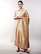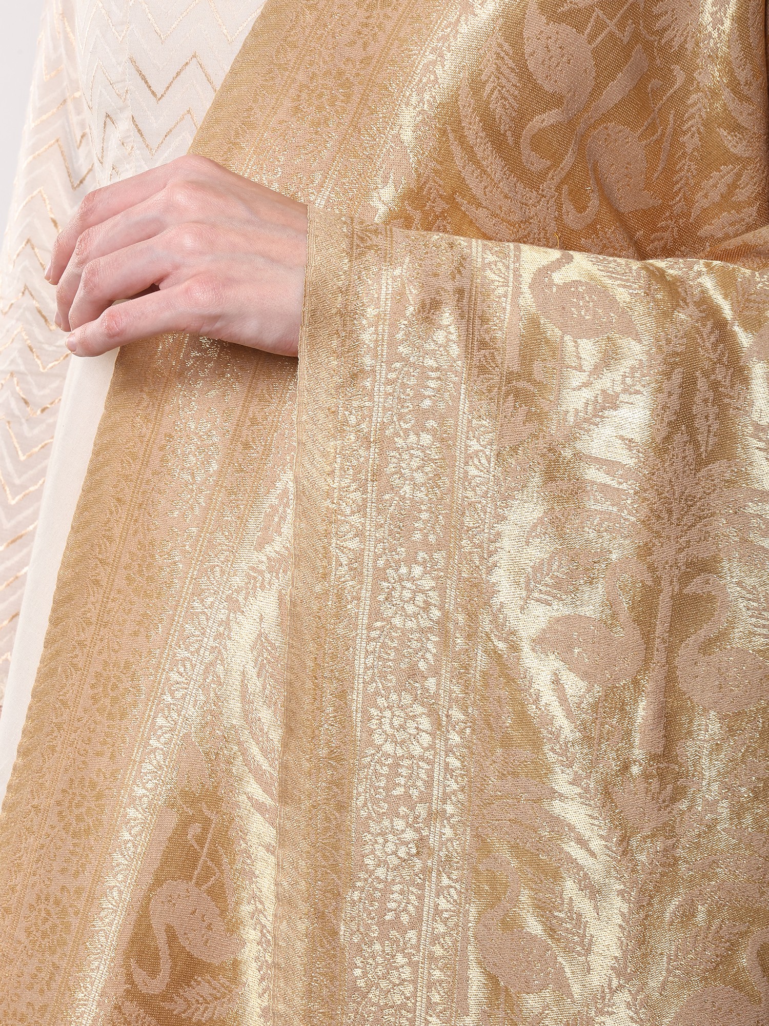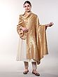 You'll appreciate the generous dimensions, measuring a sweeping ninety-four inches in length and forty-five inches in width. This expansive canvas allows the intricate motifs to unfold in full glory, while the rich, frosted-almond hue provides a sophisticated backdrop for the shimmering Zari work. The detailed border frames the central design with a refined elegance that speaks volumes.
