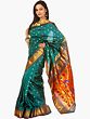 A brilliant length of textile, this Paithani ‘sari’ woven by the most skilled hands of Gadwal weavers, another great centre of the art of sari-weaving in Deccan – Andhra Pradesh, on their hand-driven looms in pure silk yarn dyed in deep green, the colour specially appreciated for its cool effect and most favoured by Islamic populace, and the gold zari, represents one of the most celebrated classical styles of Indian saris. Now also woven on power-driven looms a hand-woven Paithani is still a rarity and highly valued textile, especially among elite and those who seek glamorous look and exclusivity in tradition. Paithani, a style of sari with rare distinction reflecting in its over-all design and patterning as well as in weaving technique, relates to Paithan, a town some few kilometers from Aurangabad.