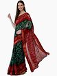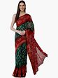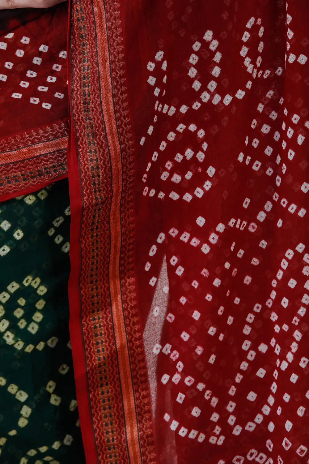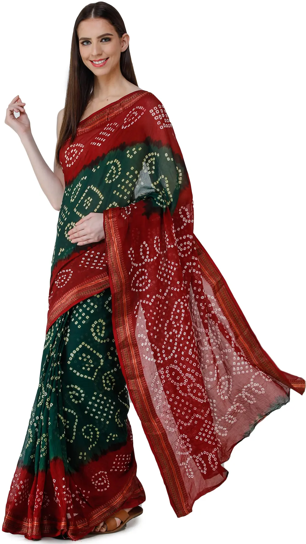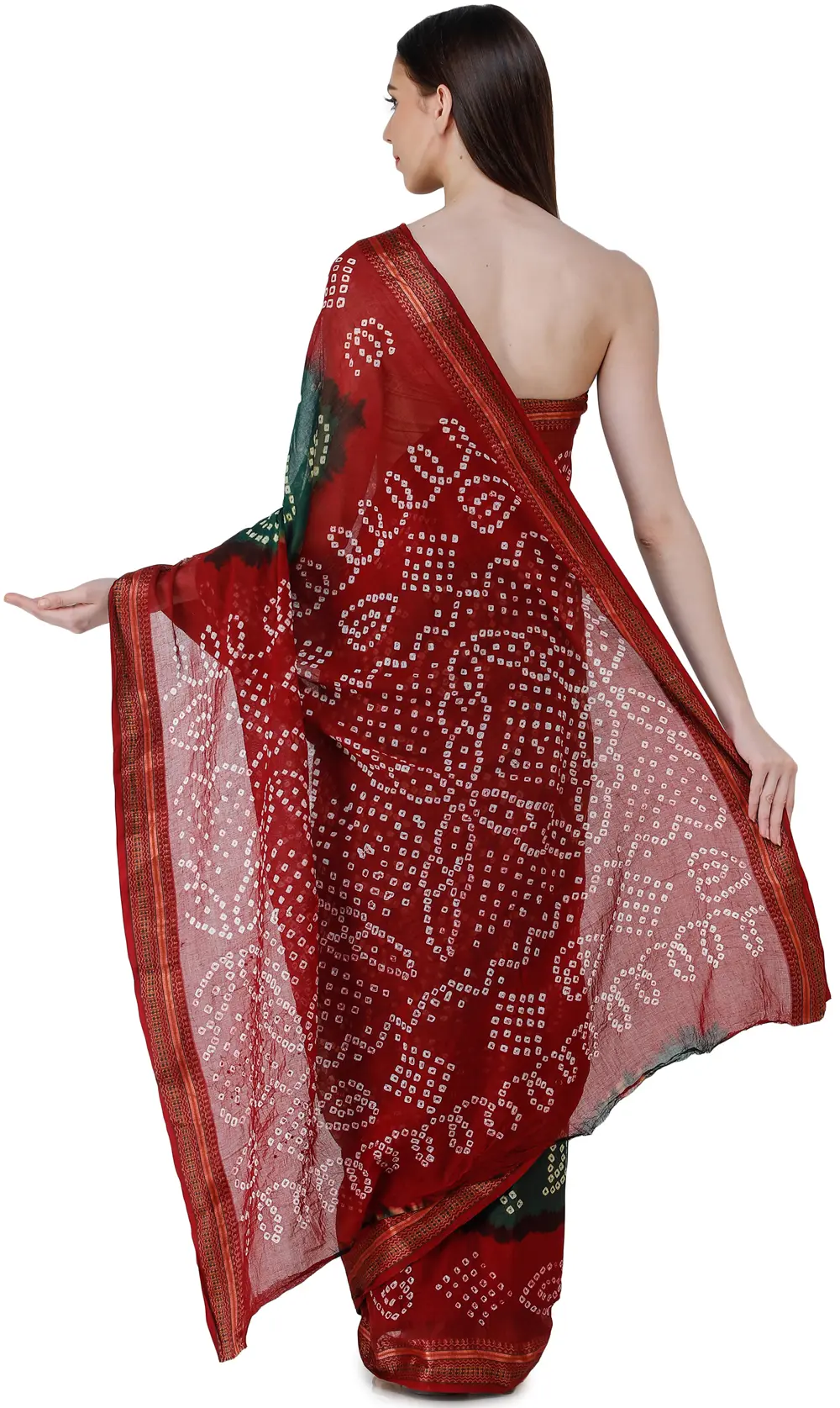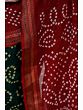 The heart of this saree's allure lies in its authentic Bandhani work. This ancient resist-dyeing technique involves meticulously tying small knots into the fabric before dyeing it, resulting in intricate patterns when the knots are released. The white dots and diamond-shaped motifs scattered across the garnet-red and dark-green base are a hallmark of this craft, each one a tiny masterpiece of precision and patience. The tie-dye process imparts a distinct, slightly irregular charm, making each saree a unique creation. The interplay of the bold color blocks with the delicate white patterns creates a dynamic visual appeal, perfect for festive occasions or elegant everyday wear.