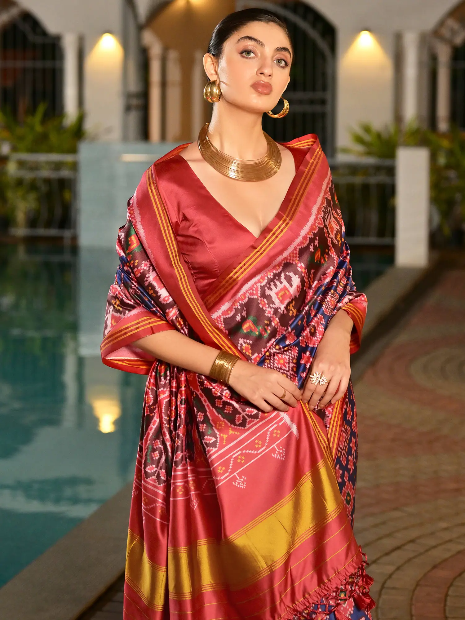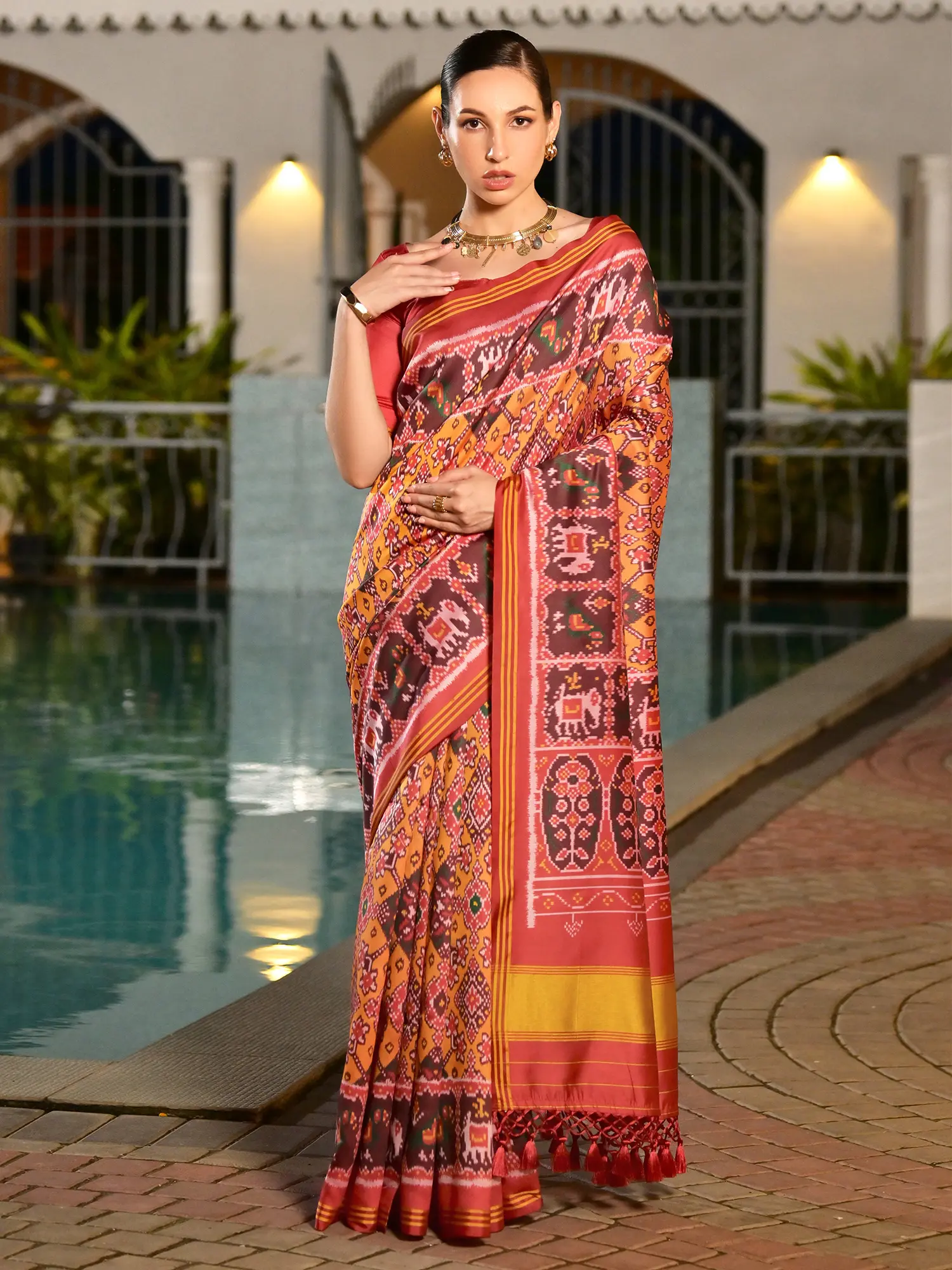 Immerse yourself in the rich heritage of Indian textiles with this exquisite Banarasi Patola Silk Saree. Woven from the finest silk, this saree is a testament to the artistry and dedication of master weavers. The fabric itself possesses a lustrous sheen and a fluid drape, promising a graceful and elegant silhouette that will turn heads at any occasion. Its luxurious feel against the skin adds an element of pure indulgence to this already stunning piece.