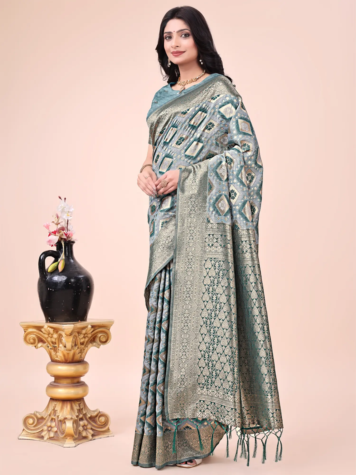 Tissue Saree from Banaras with All-over Woven Geometric Pattern
