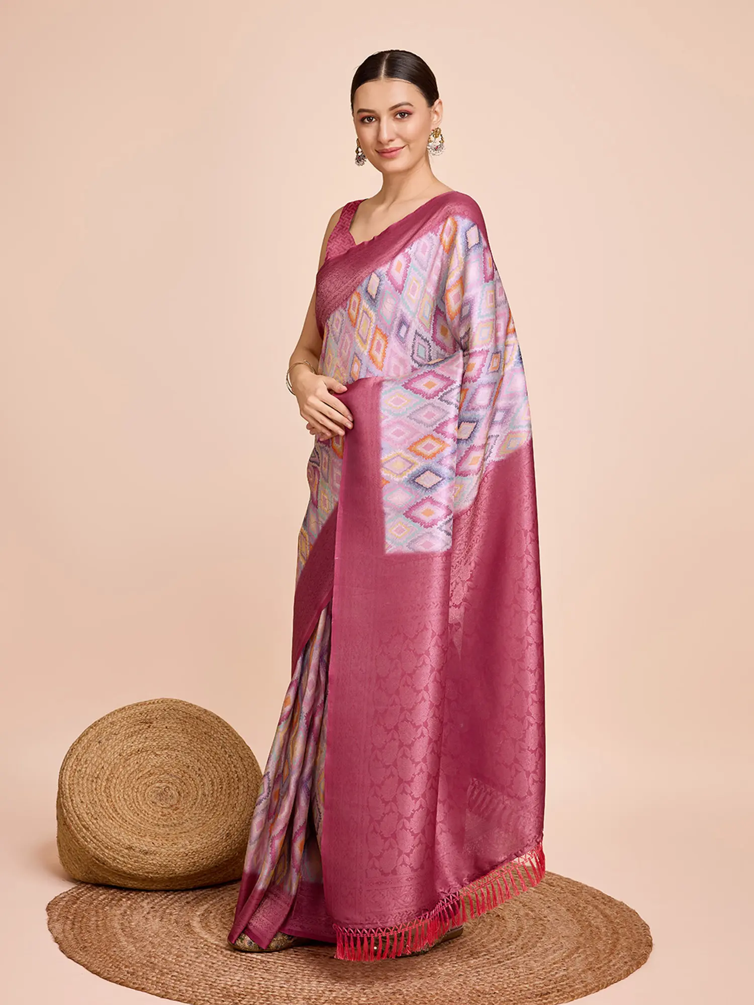 The true grandeur of this saree is revealed in its meticulously crafted pallu and border. The contrasting deep magenta border is a symphony of traditional Kanjivaram weaving, showcasing elaborate jari work that speaks volumes of the weaver's skill. The intricate motifs woven into the border create a rich textural contrast with the printed body of the saree, adding a layer of depth and sophistication. The pallu itself is a continuation of this regal design, culminating in delicately tied tassels that lend a playful yet elegant finish. This rich detailing ensures that every angle of the saree presents a breathtaking panorama of artistry.