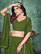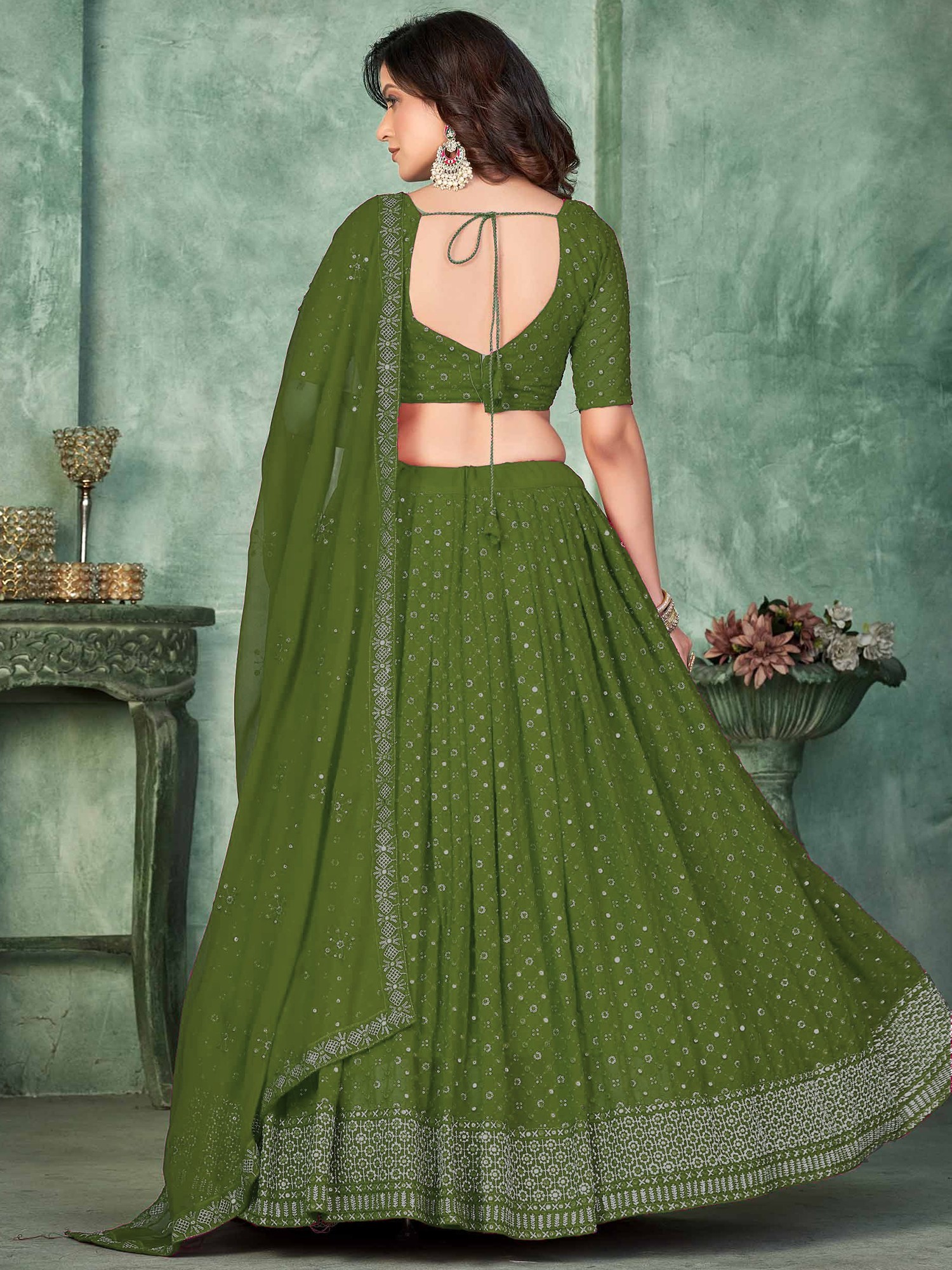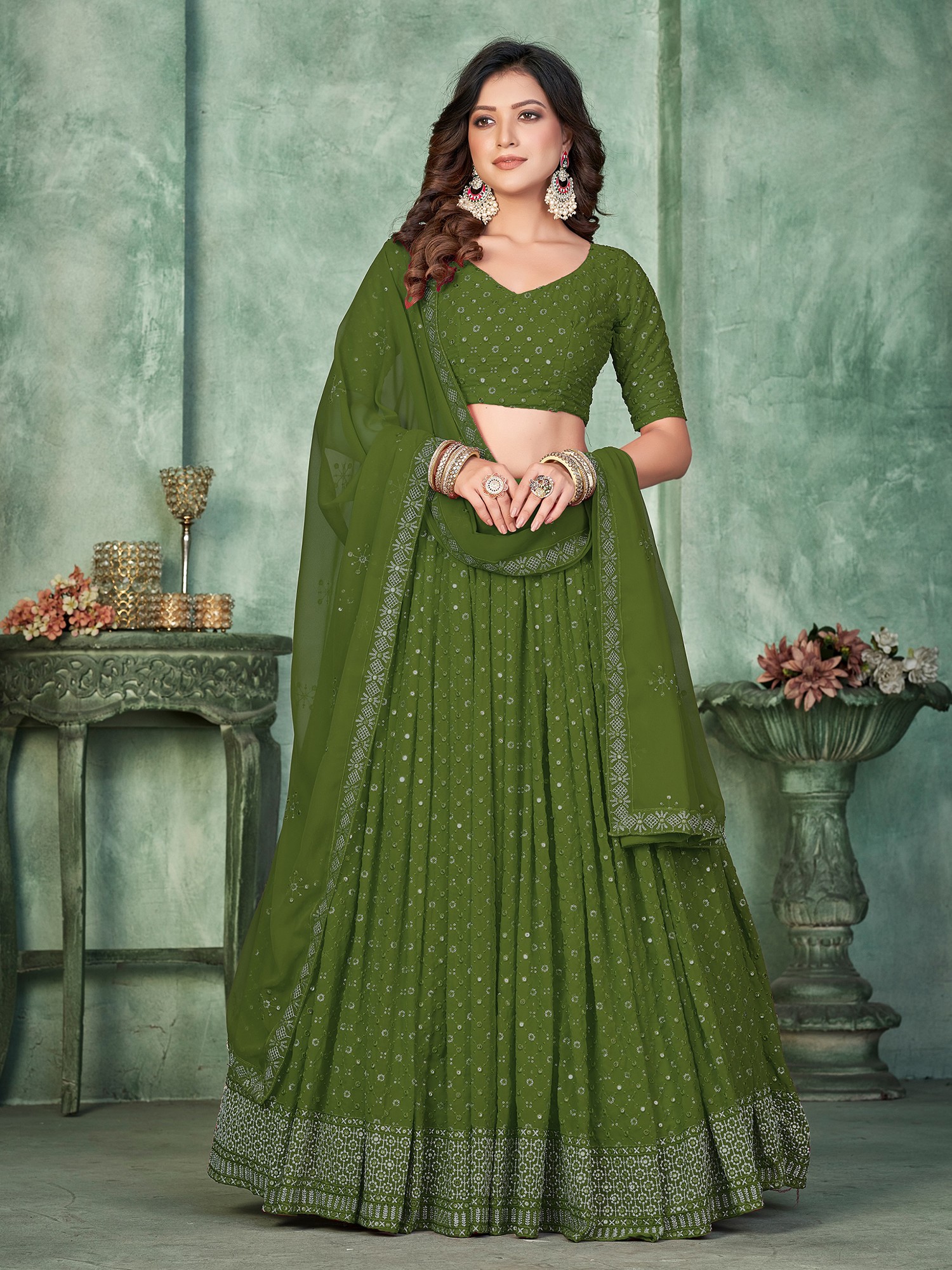 Step into the spotlight with this exquisite Georgette Lehenga Choli, a masterpiece designed to make you shine at any wedding celebration. Crafted from luxurious georgette fabric, this ensemble drapes beautifully, offering both comfort and a sophisticated silhouette. The rich, vibrant green hue is both timeless and on-trend, providing a stunning backdrop for the intricate detailing that truly sets this piece apart.