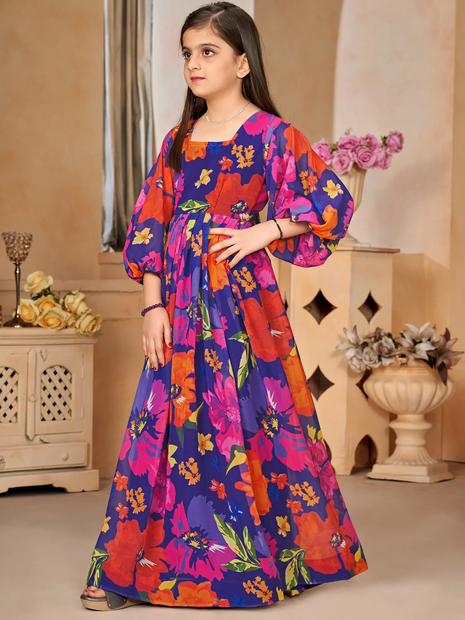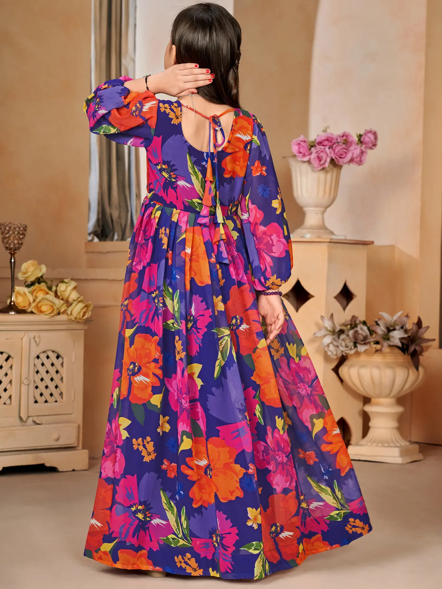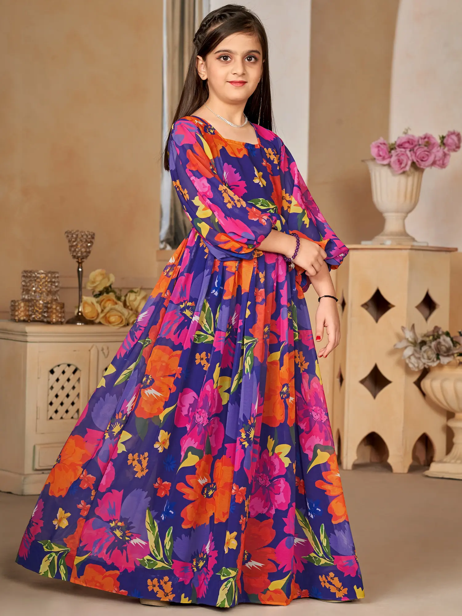 Crafted from high-quality georgette, this gown offers a luxurious feel against the skin. The fabric's light and airy nature ensures that your child can move with ease and comfort, making it ideal for hours of play and festivities. The Anarkali style, characterized by its flowing, flared hemline, adds a touch of traditional charm and sophistication. The design features a flattering square neckline and full sleeves with a delicate gather at the cuff, adding a touch of playful volume. The print itself is a digital marvel, showcasing intricate details and vivid color saturation that brings the floral motif to life.