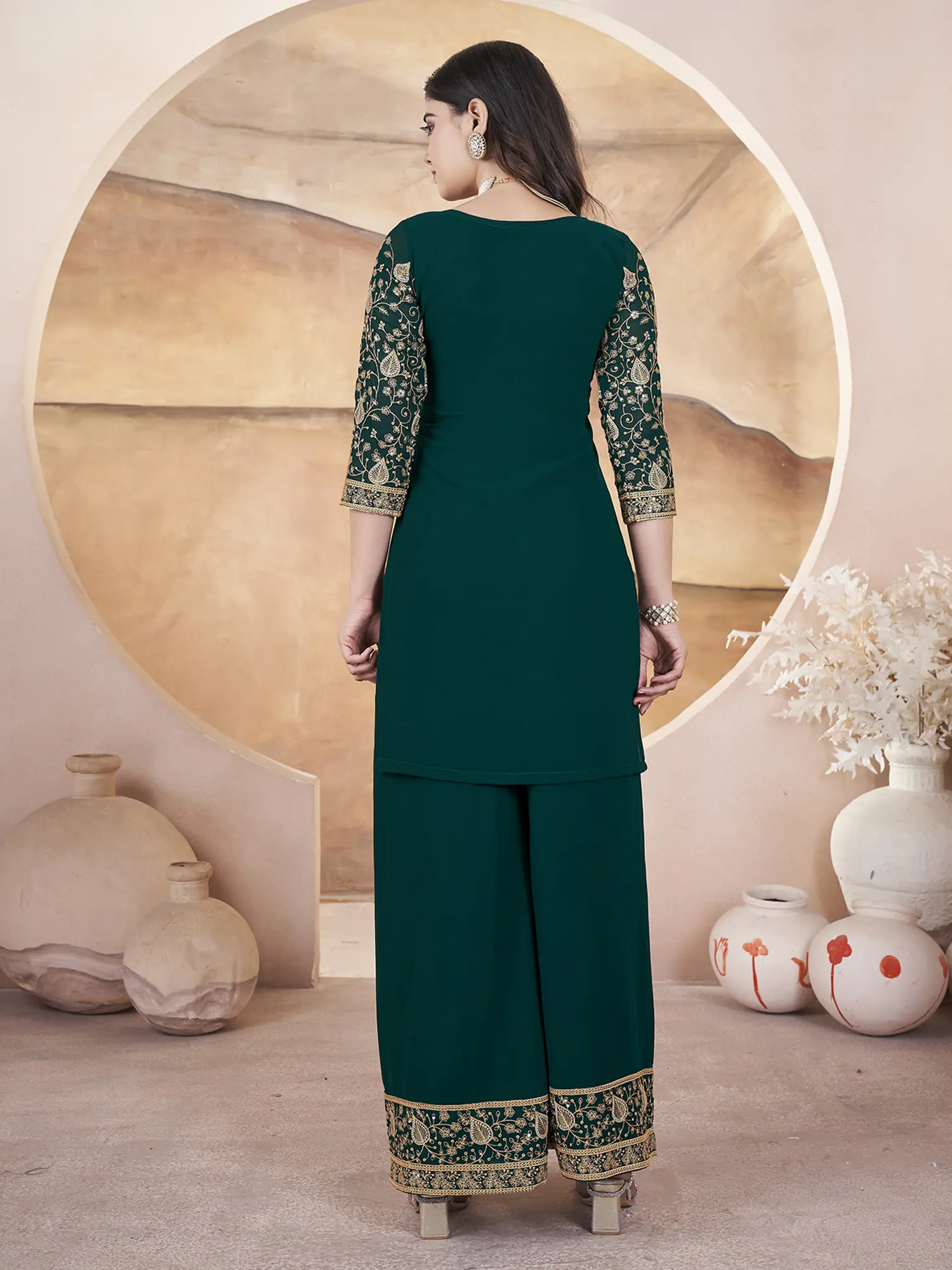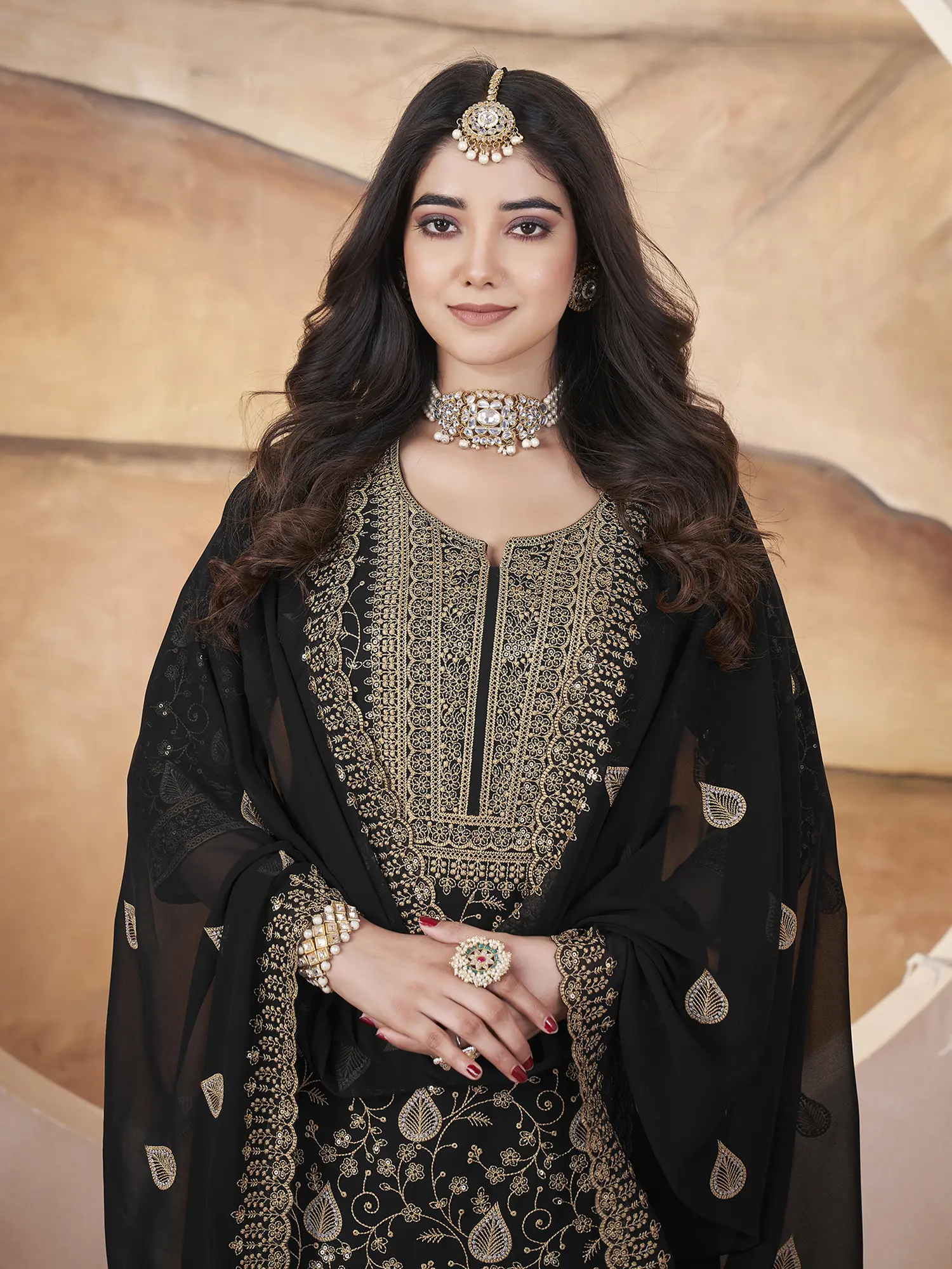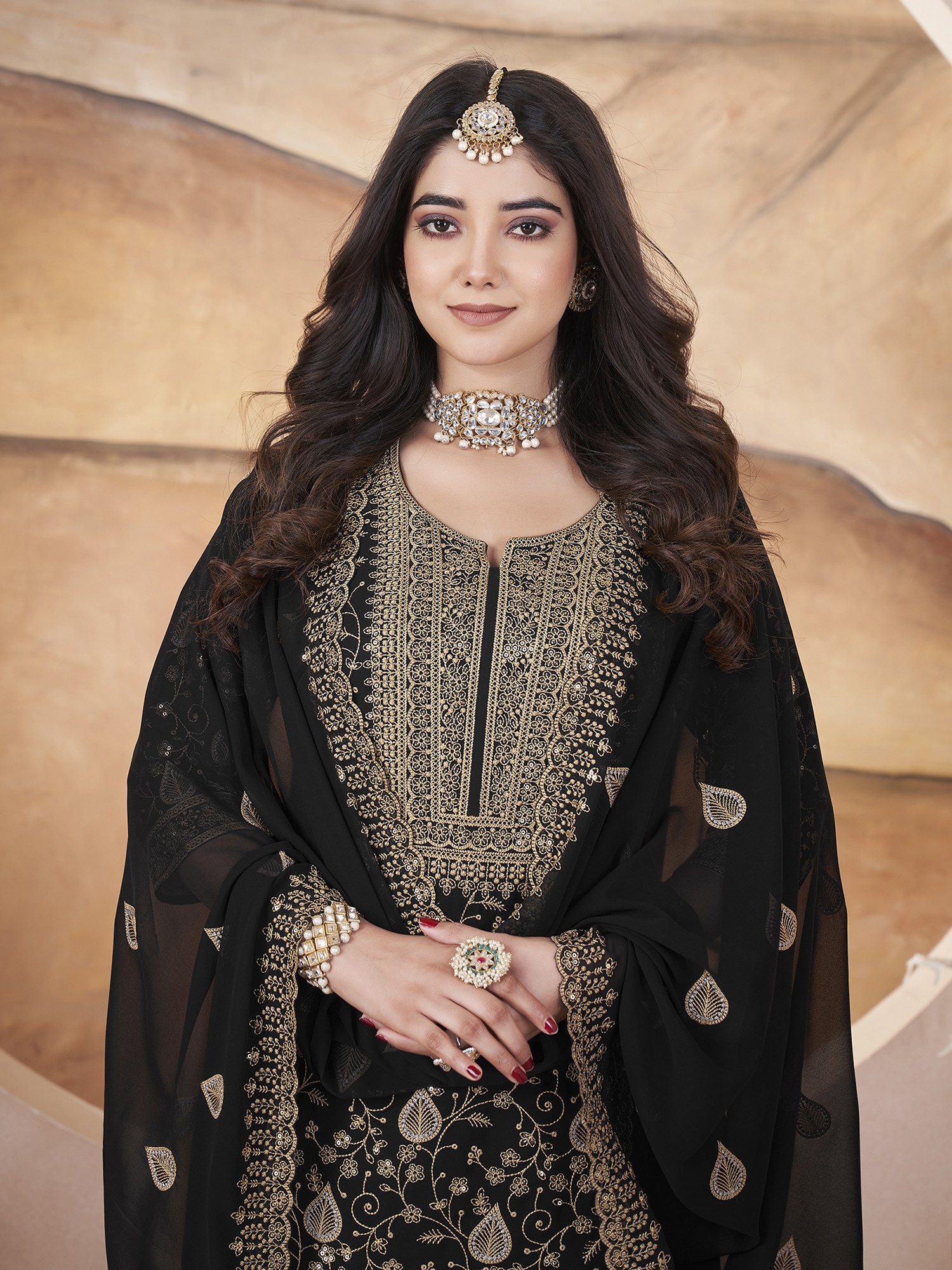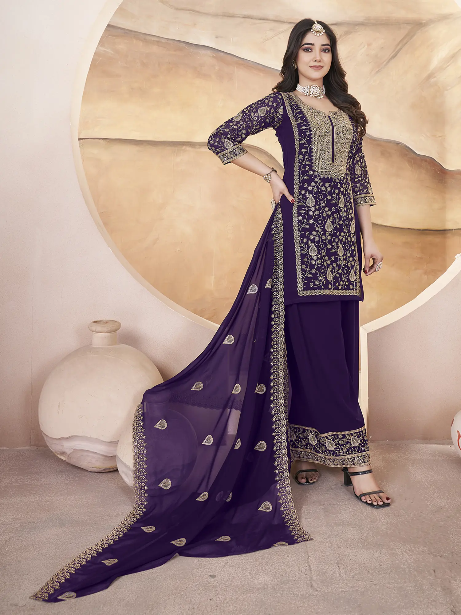 Georgette Embroidery And Sequins Work Round Neck Fancy Kurta With Matching Bottom And Dupatta