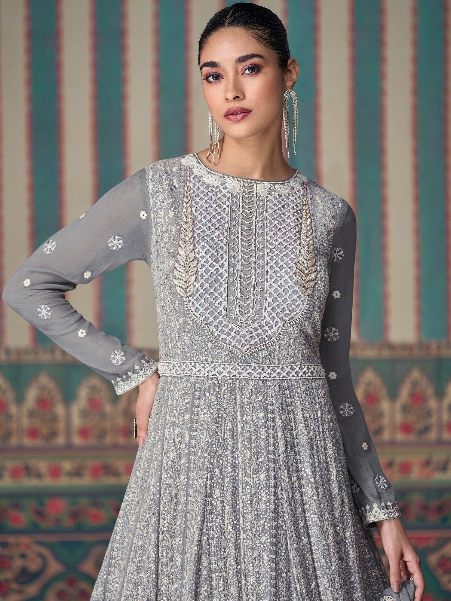 Stunning Embellished Heavy Sequins And Embroidery Work Georgette Anarkali Gown With Matching Dupatta