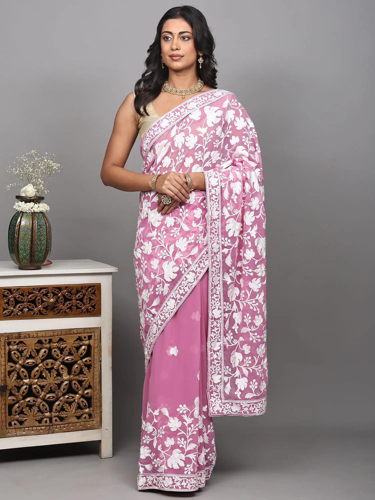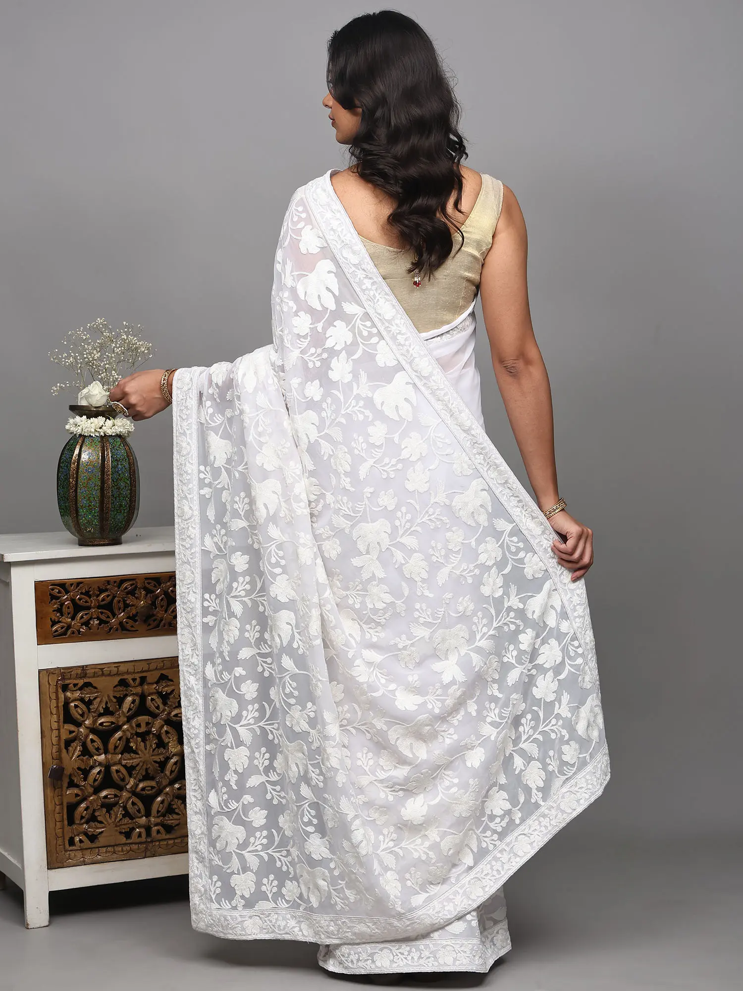 Lucent-White Georgette Saree with Aari Embroidered Floral Motifs from Kashmir