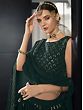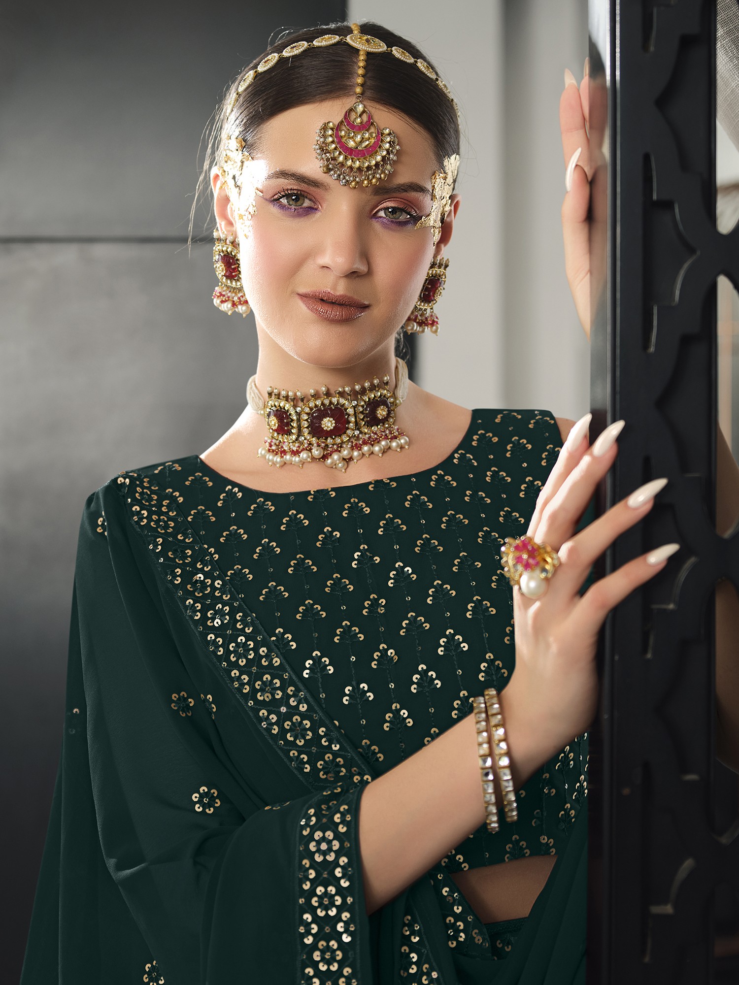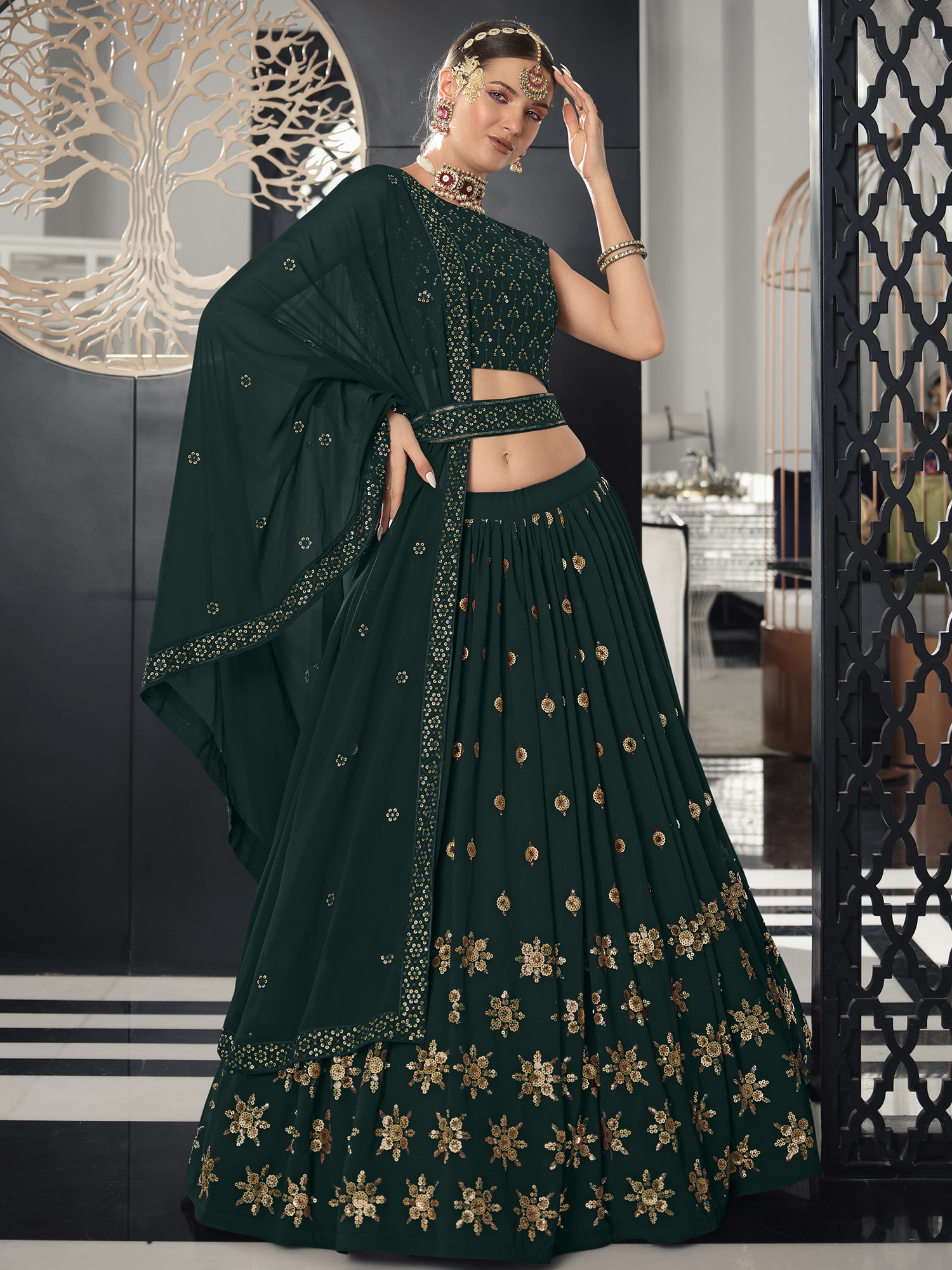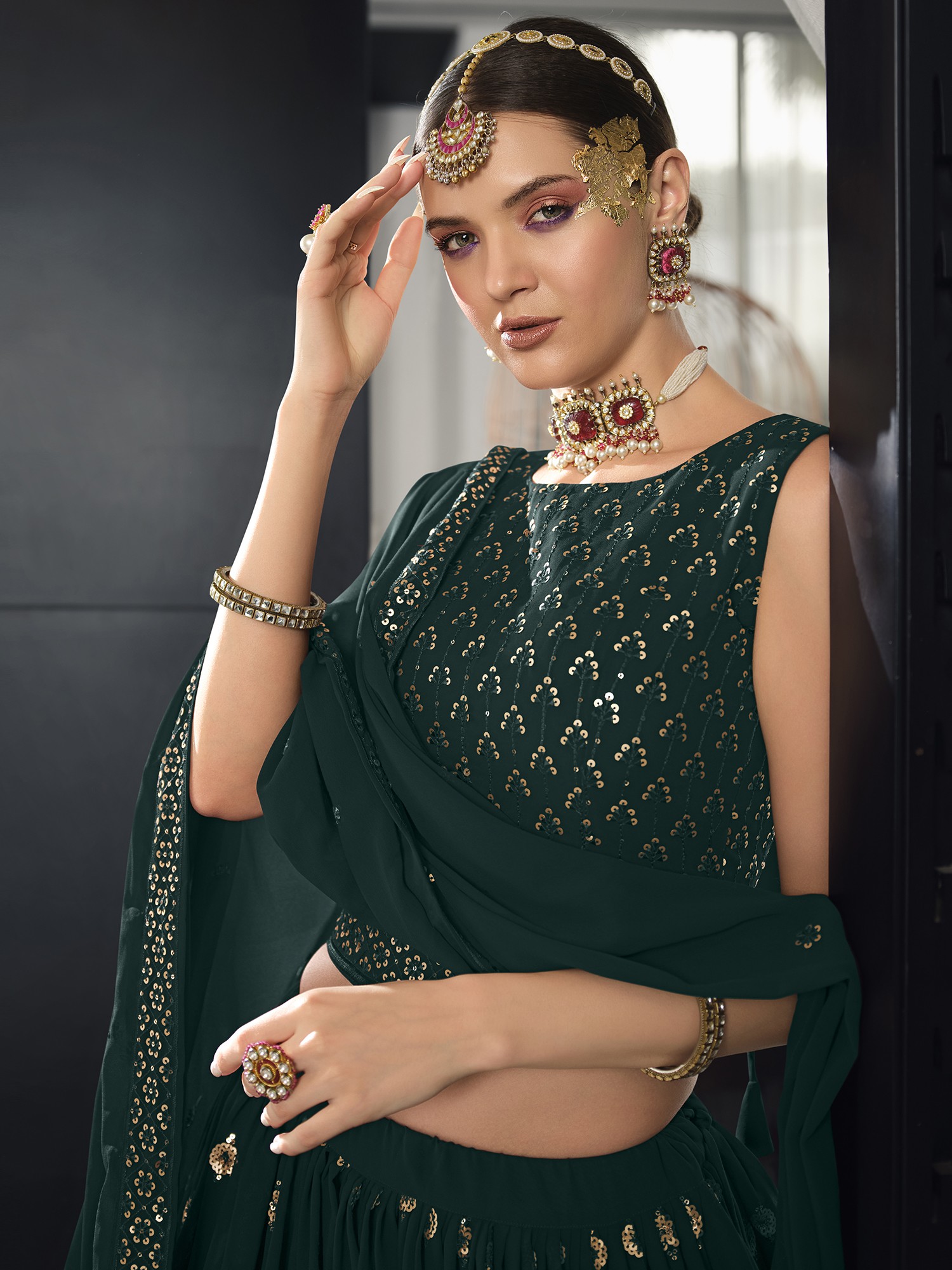 Bottle-Green Net Beads and Golden Thread Embroidery Lehenga Choli with Cutwork Dupatta