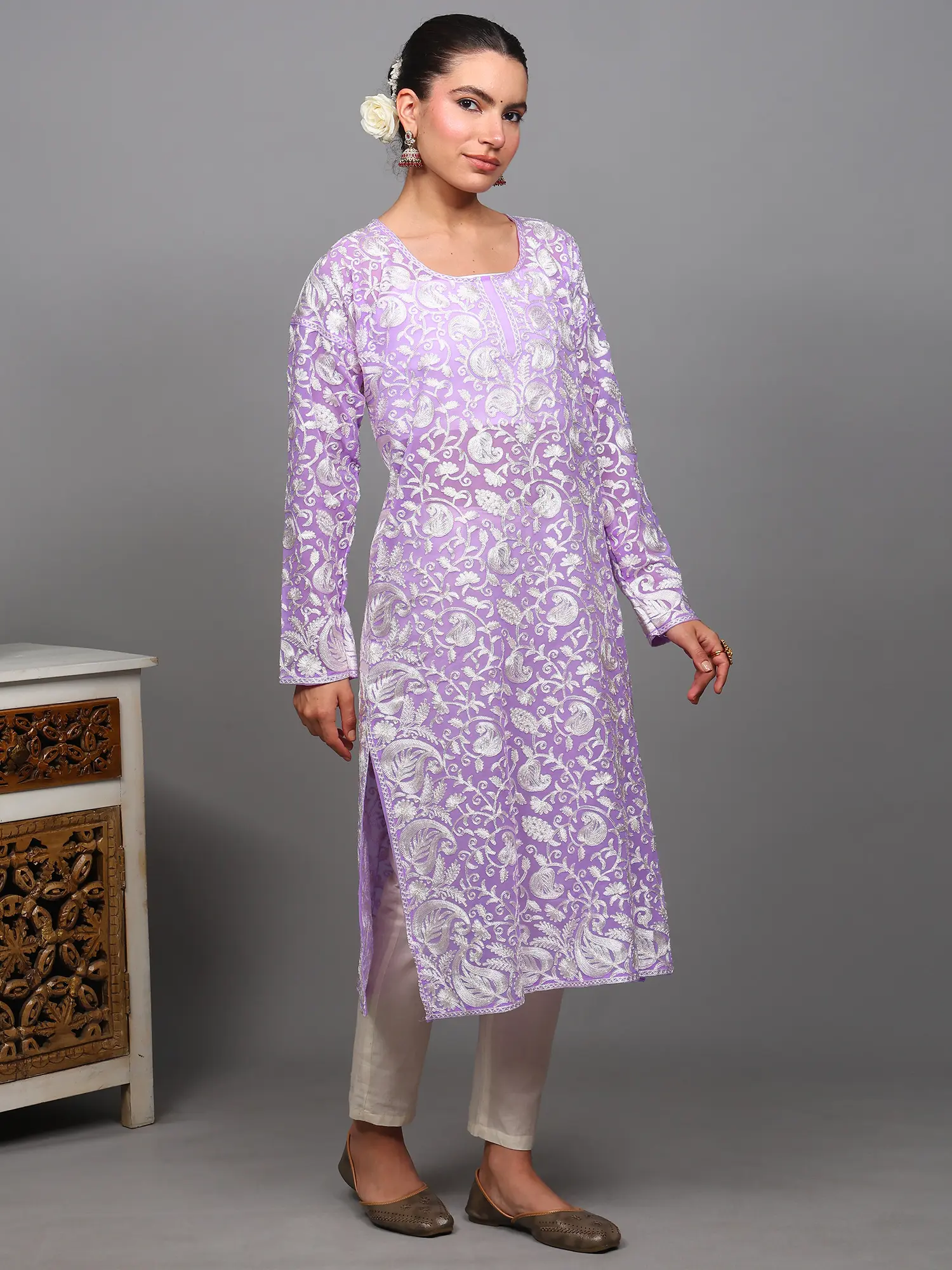 Step into a world of refined beauty with this exquisite lilac georgette kurti. Crafted from a lightweight and airy georgette fabric, this kurti drapes gracefully, offering both comfort and a flattering silhouette. Its soft lilac hue provides a delicate and sophisticated canvas, perfect for any occasion that calls for understated glamour.