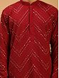 Crafted with meticulous precision, the georgette Kurta is adorned with intricate mirror work, each reflective piece shimmering like stars in a midnight sky. Its zig-zag pattern adds a touch of playful sophistication to the ensemble, dancing with grace and allure. The accompanying viscose blend Pajama, luxurious and breathable, drapes effortlessly, promising a sensation of feather-light ease. Together, they create a timeless silhouette that embodies the fusion of tradition and modernity, making a statement that resonates with those who appreciate the artistry of fashion.