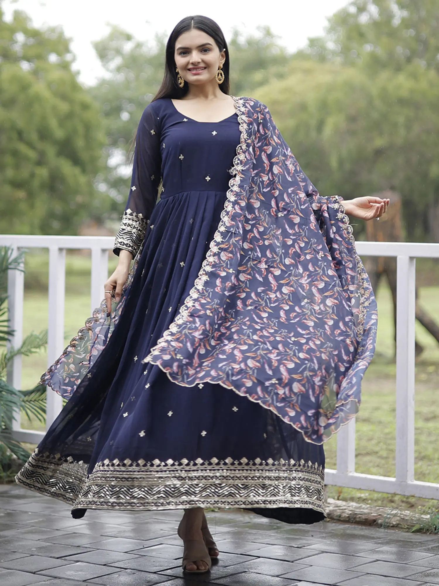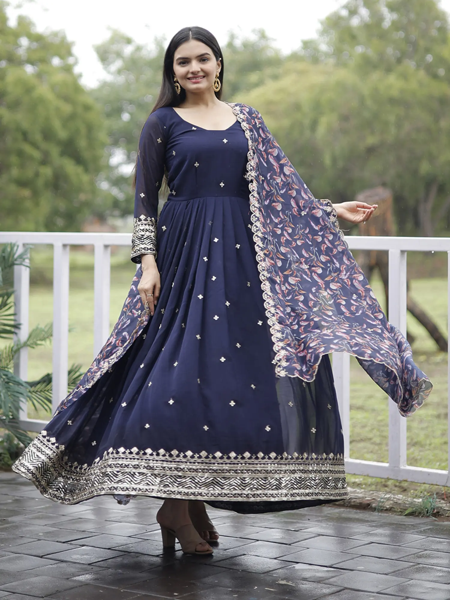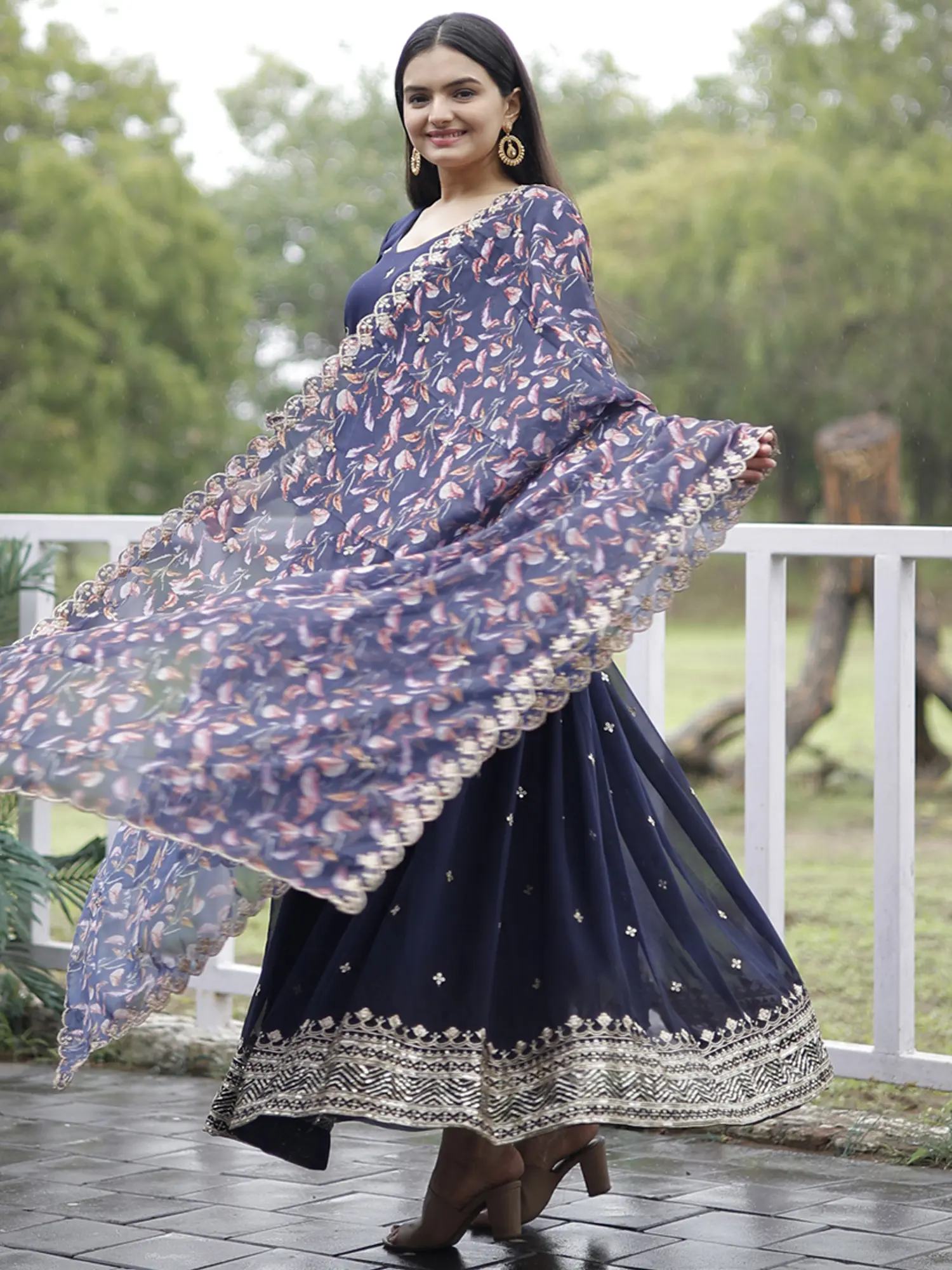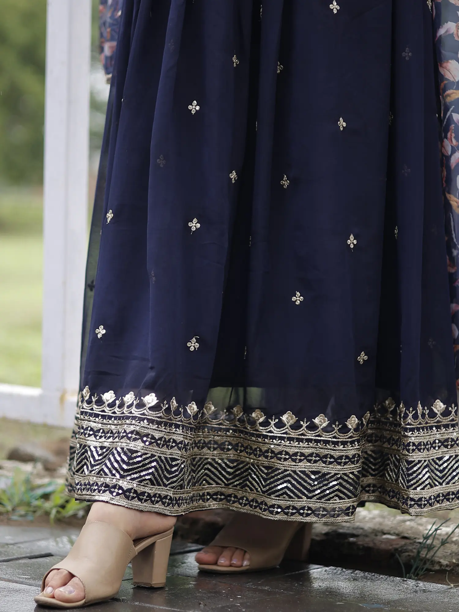 Define the royalty of blue with this georgette navy blue designer suit. Tailored to fit and flow tastefully, the suit is decorated traditionally, with stunning sequin details all over and intricate work on the edge inspired by the luxurious heritage kurta and lehengas of the early days. The dupatta matches the suit, adding a modern touch to the ethnic elements of the suit with its lovely floral spread and scalloped border.