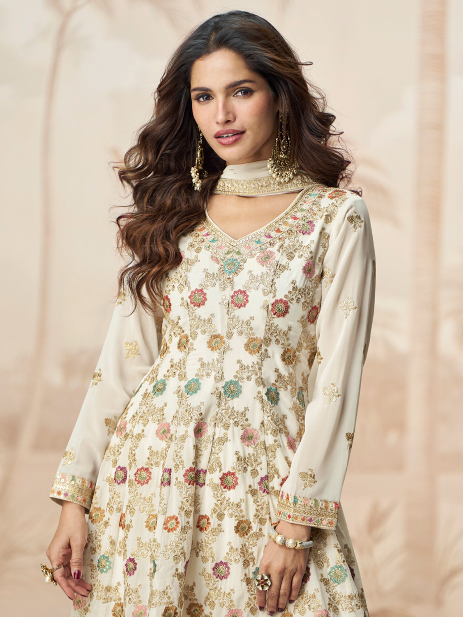 Long Churidar Salwar Kameez Suit with Zari-Embroidered Florals and Crystals
